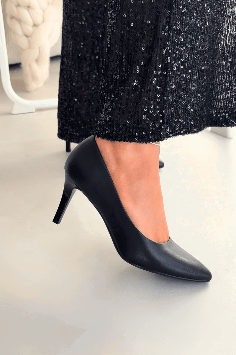 Elegantiški aukštakulniai bateliai moterims iš eko odos – stilingas pasirinkimas tiek kasdienai, tiek ypatingoms progoms. Smailėjanti nosele ir juoda spalva suteikia klasikinio žavesio, o universalus dizainas puikiai tinka bateliams derinti prie darbo ar vakarinių derinių.