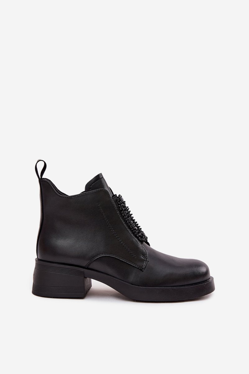 Juodi odiniai aulinukai su dekoratyvine sagtimi – tai stilingas pasirinkimas rudens ir žiemos sezonui.