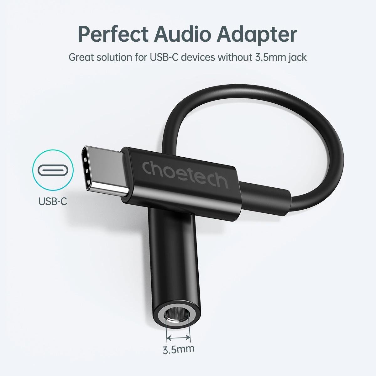 Choetech AUX003 garso adapteris su USB C jungtimi sujungimą su bet kokiu garso įrenginiu, turinčiu 3,5 mm lizdo jungtį.
