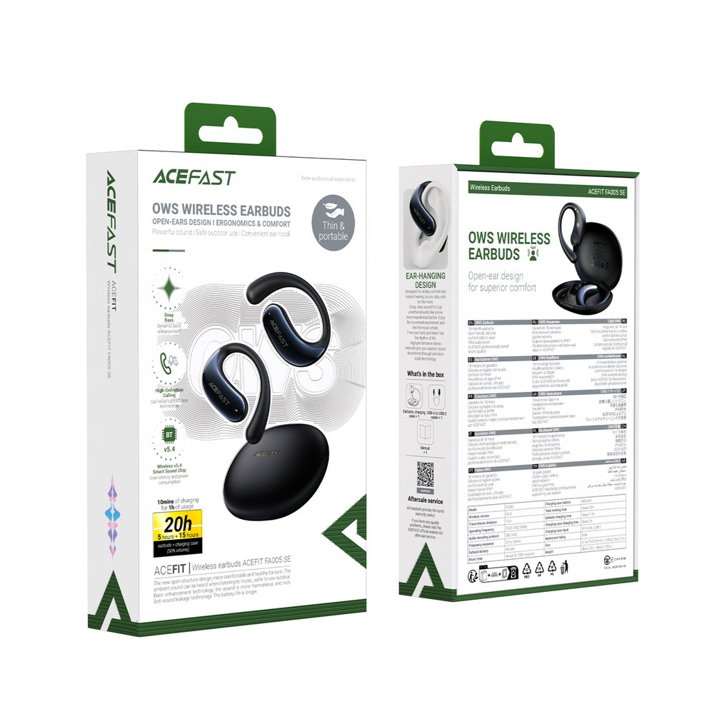Belaidės ausinės OWS dizainas suteikia atvirą garsą, todėl girdėsite aplinką kartu su muzika — tai patogu lauko treniruotėms ir pasivaikščiojimams. Ausinės palaiko iki 20 val. bendro veikimo su įkrovimo dėklu ir pasižymi ergonominiais ausies kabliukais stabiliai fiksacijai. Modelis iš Acefast serijos orientuotas į mobilumą: plonas, lengvas dėklas leidžia nešiotis ausines kišenėje ar rankinėje.