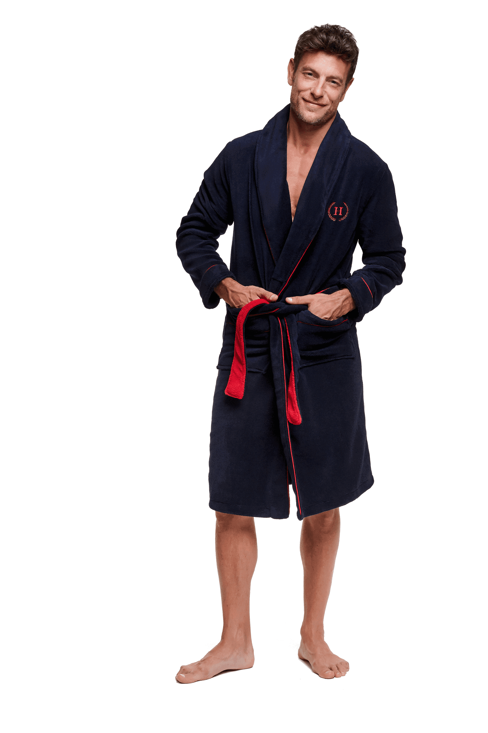 Išskirtinis Henderson chalatas su skara apykakle. Itin švelnus ir tikrai vyriškas. Tamsiai tamsiai mėlynos spalvos, (navy tipo), dekoruota raudona apdaila. Ant krūtinės išsiuvinėta raidė H . Klubai su kišenėmis, ties juosmeniu surišamas. Labai geros kokybės. Puikiai tinka dovanai. Sudėtis 100% poliesteris.