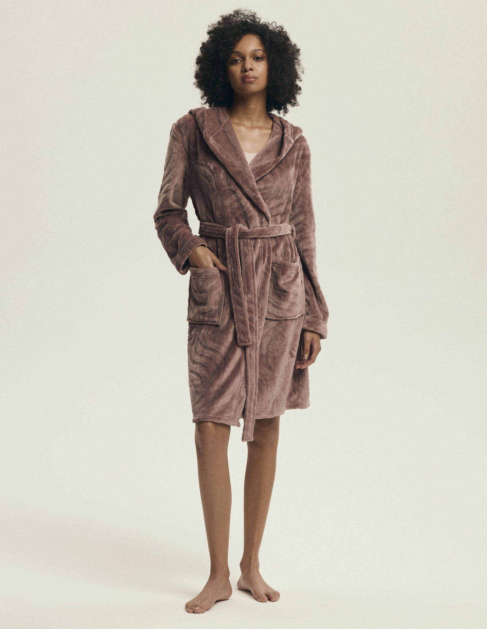 Trumpas, su gobtuvu ir kišenėmis, pilkai atspalvio chalatas Devyn – minkštas, patogus ir šiltas pasirinkimas namų poilsiui.