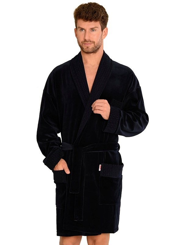 Glonus veliūrinis chalatas su dekoratyvine skara apykakle. Sukirpta be gobtuvo, su kišene ant krūtinės, klubų ir raišteliu ties juosmeniu. Sukurta vyrui, vertinančiam unikalius dalykus.