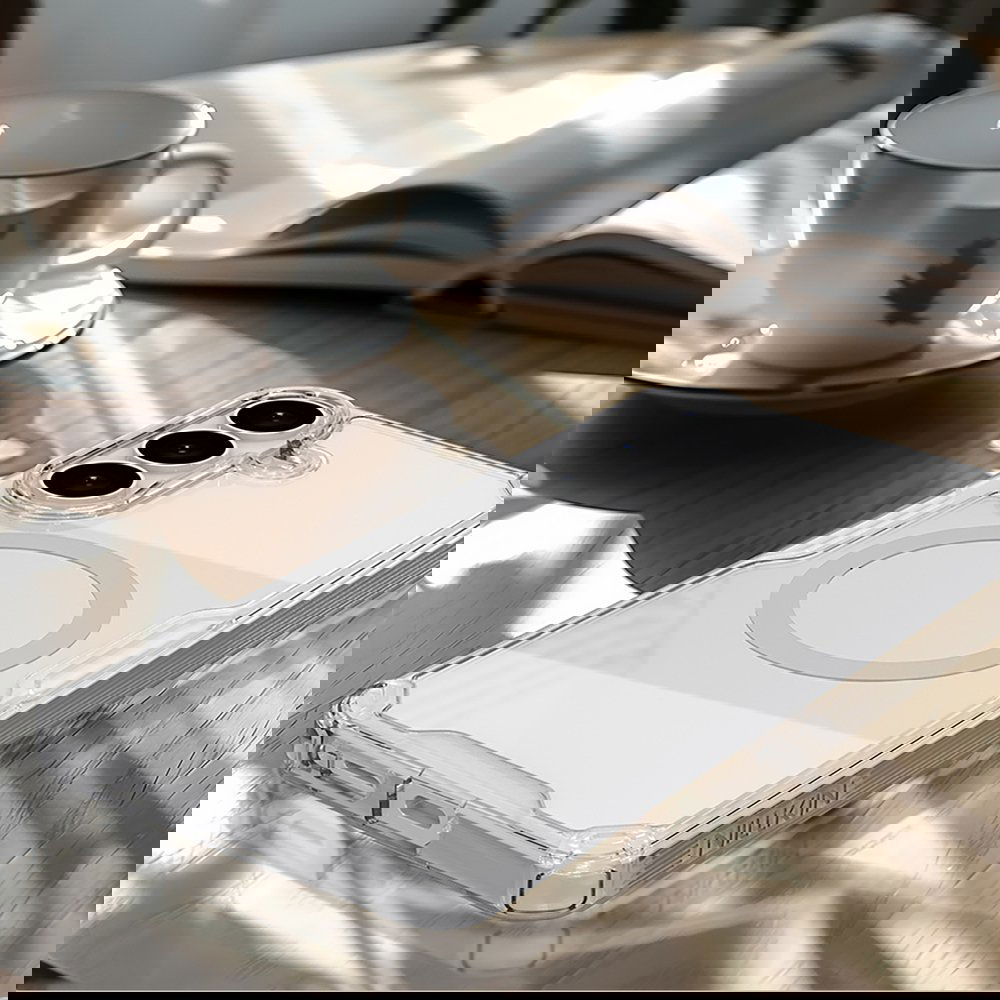 Dėklas Samsung Galaxy S26+ suderinamas su MagSafe, permatomas – saugo telefono nugarėlę ir kraštus nuo įbrėžimų, tuo pačiu leidžia naudoti magnetines įkrovimo priemones be dėklo nuėmimo. Kietas PC nugarėlės sluoksnis kartu su lanksčia TPU rėmele sugeria smūgius, o sustiprinti kampai su oro pagalvėlėmis mažina kritimo žalos riziką. Pusiau permatomas baltos spalvos paviršius pabrėžia telefono dizainą, neaukojant apsaugos.