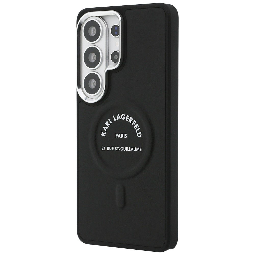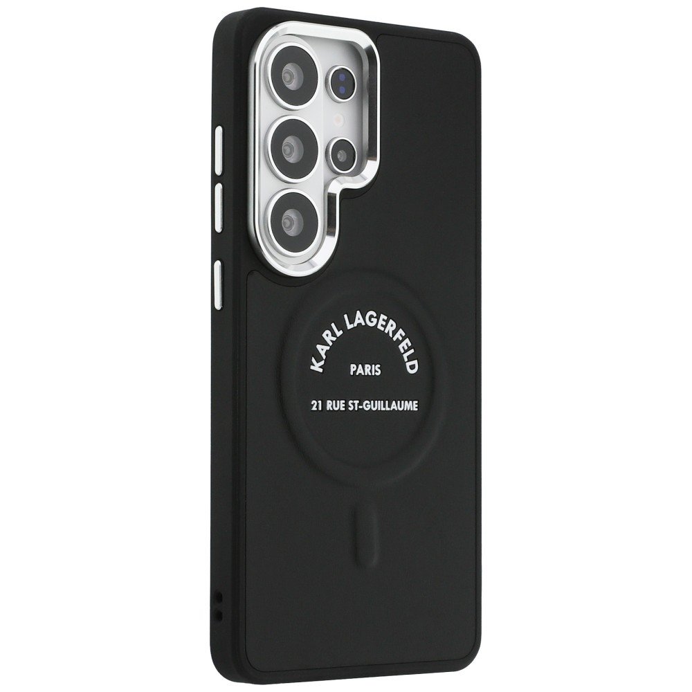 Dėklas Samsung Galaxy S26 Ultra iš dirbtinės odos pasiūlo apsaugą ir vientisą dizainą, kuriame integruotas magnetinis žiedas suderinamas su MagSafe — patogu krauti be dėklo nuėmimo ir išlaikyti kasdienį funkcionalumą. Juodas paviršius su iškildu logotipu suteikia diskretiško prabangos įspūdį, o aliumininiai mygtukų ir kameros rėmai pagerina išvaizdą ir atsparumą. Karl Lagerfeld kolekcijos detalės akcentuoja dizainą be papildomų puošmenų.