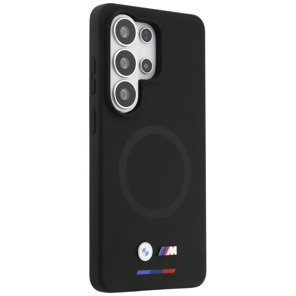 Dėklas Samsung Galaxy S26 Ultra suderinamas su MagSafe – juodas silikoninis variantas, suteikiantis patogų magnetinį įsistatymą ir greitą belaidį įkrovimą. Jis pasižymi siauru profiliu, minkštu mikropluošto pamušalu viduje ir subtiliu įspaustu MagSafe žiedu, todėl telefono forma išlieka kompaktiška, o korpusas apsaugomas nuo smulkių įbrėžimų. Dėklas sukurtas kaip licencijuotas BMW M Silicon Logo leidimas, kuriame matomos mėlynos–tamsiai mėlynos–raudonos linijos.