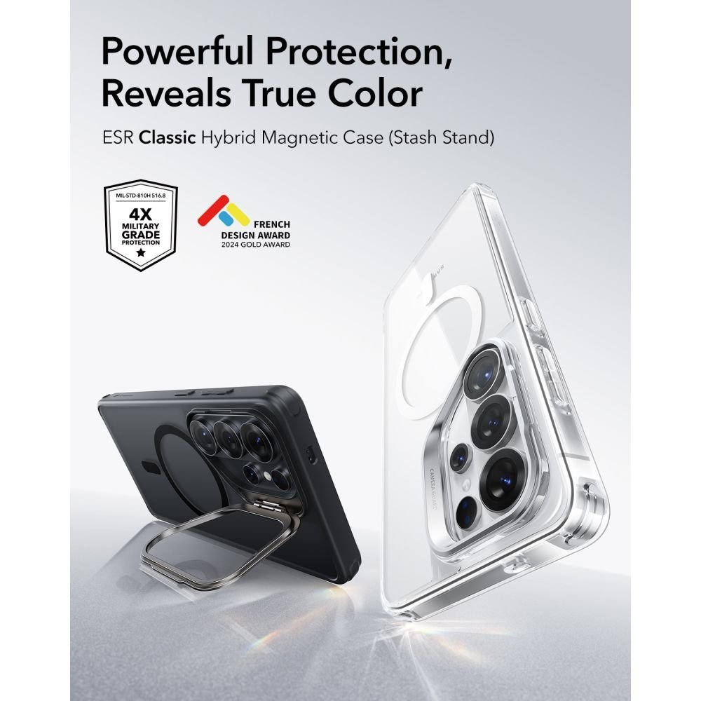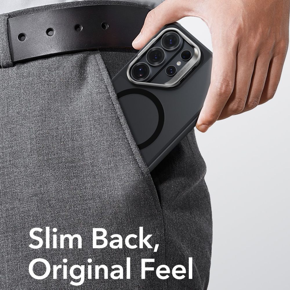 Hibridinis dėklas su integruota atrama sukurtas Samsung Galaxy S26 Ultra modeliui, užtikrina patikimą apsaugą ir funkcionalumą. Dėl tvirto polikarbonato ir akrilo nugarėlės bei lankstaus TPU rėmelio, dėklas efektyviai sugeria smūgius ir apsaugo telefoną nepridedant nereikalingo storio. Integruotas MagSafe žiedas leidžia naudotis visais MagSafe priedais bei užtikrina efektyvų belaidį įkrovimą.