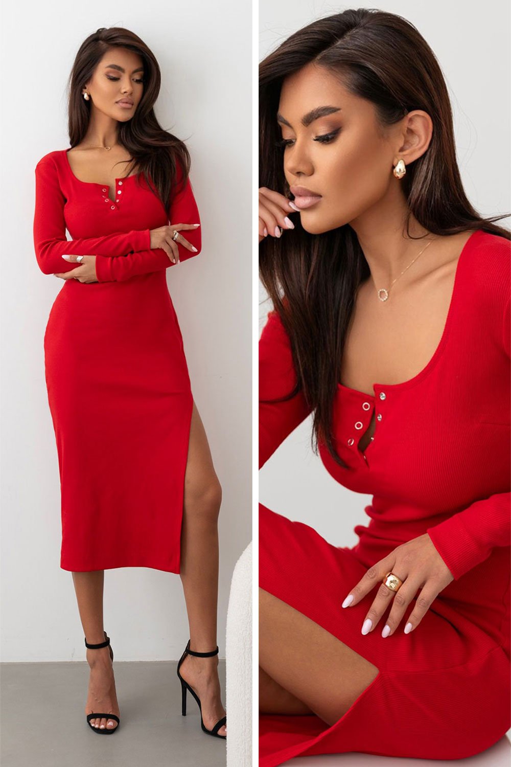 Paprastą stilių pagyvina seksuali užsegimo detalė prie iškirptės ir šoninis skeltukas.