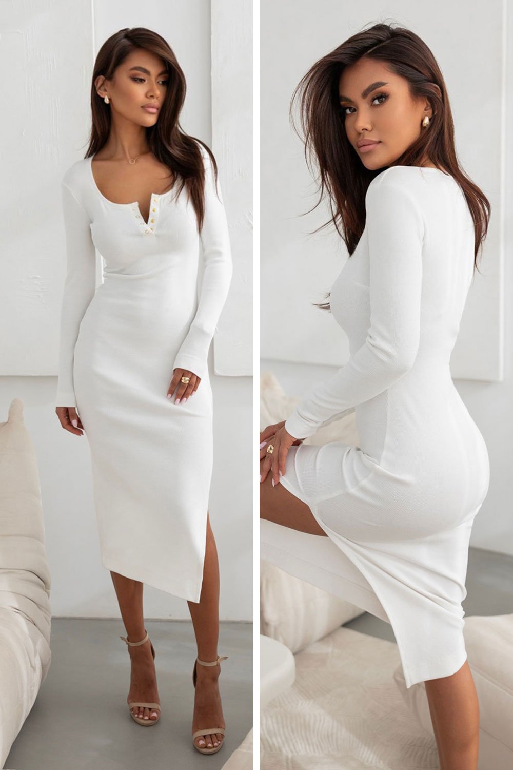 - Midi suknelė – elegantiškas ir universalus ilgis, tinkantis įvairioms progoms.