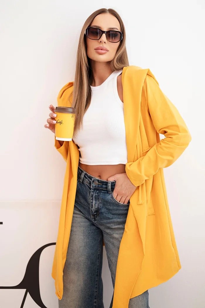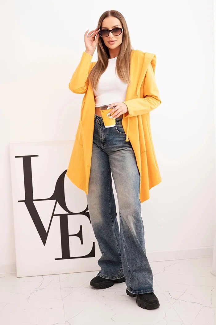 Garstyčių spalvos laisvai krentantis apsiaustas su gobtuvu