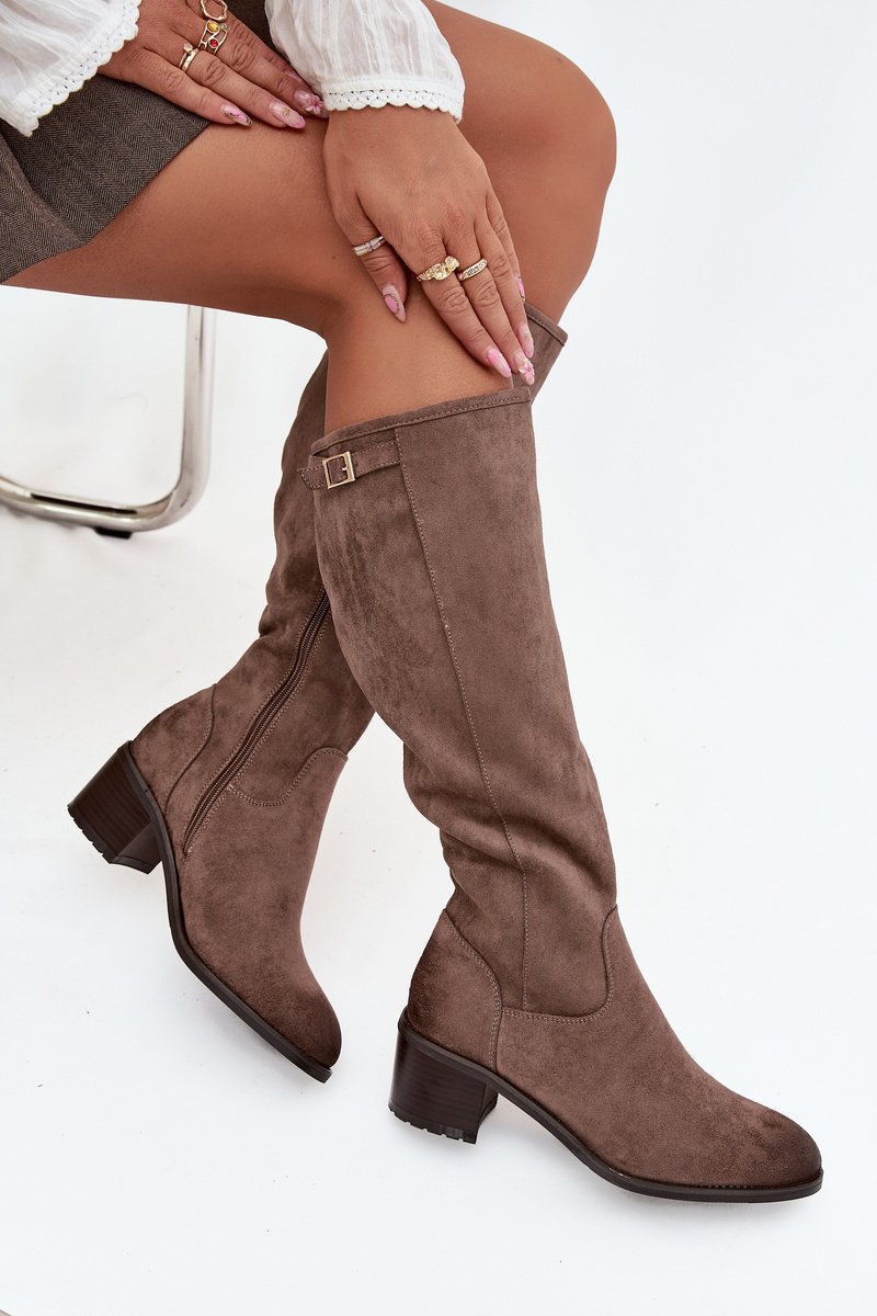 Šie smėlio spalvos ilgaauliai iš eko odos (PU)“ – elegantiškas ir praktiškas pasirinkimas vėsesniam metų laikui. Stabilus kulnas bei patogus užtrauktukas užtikrina komfortą kasdienėje rutinoje ir ypatingomis progomis. Dekoratyvinė sagtis suteikia batams subtilios prabangos. Puikiai dera tiek su sijonais, tiek su kelnėmis.