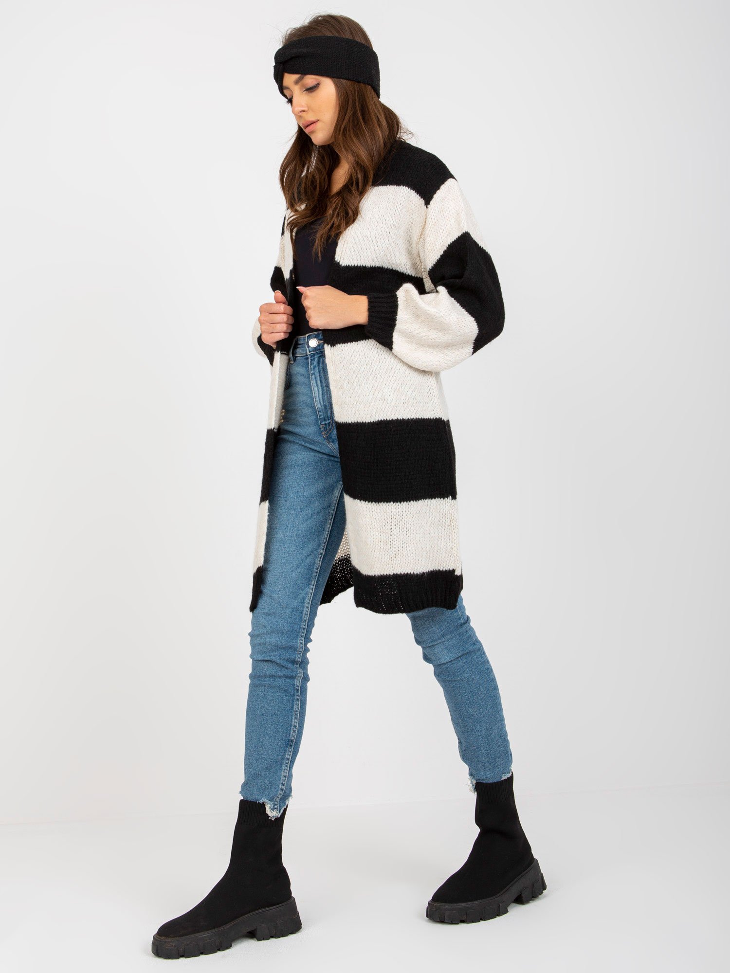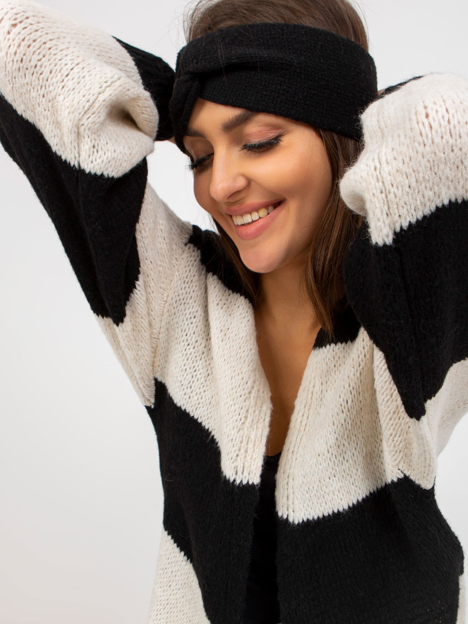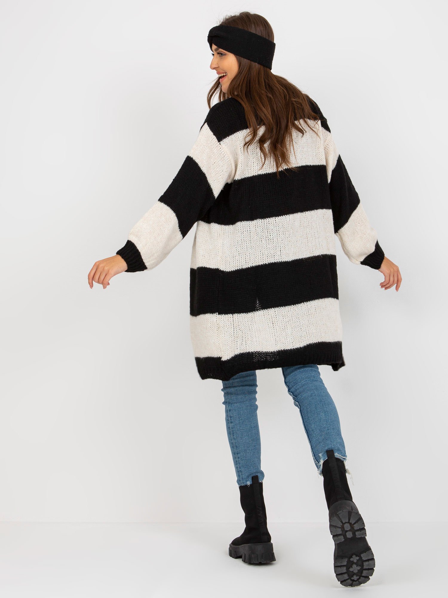 Vieno dydžio megztinio išmatavimai, matuojant lygiai: plotis po pažastimis - 65 cm, bendras ilgis - 67 cm, rankovių ilgis - 56 cm.