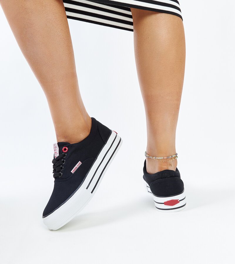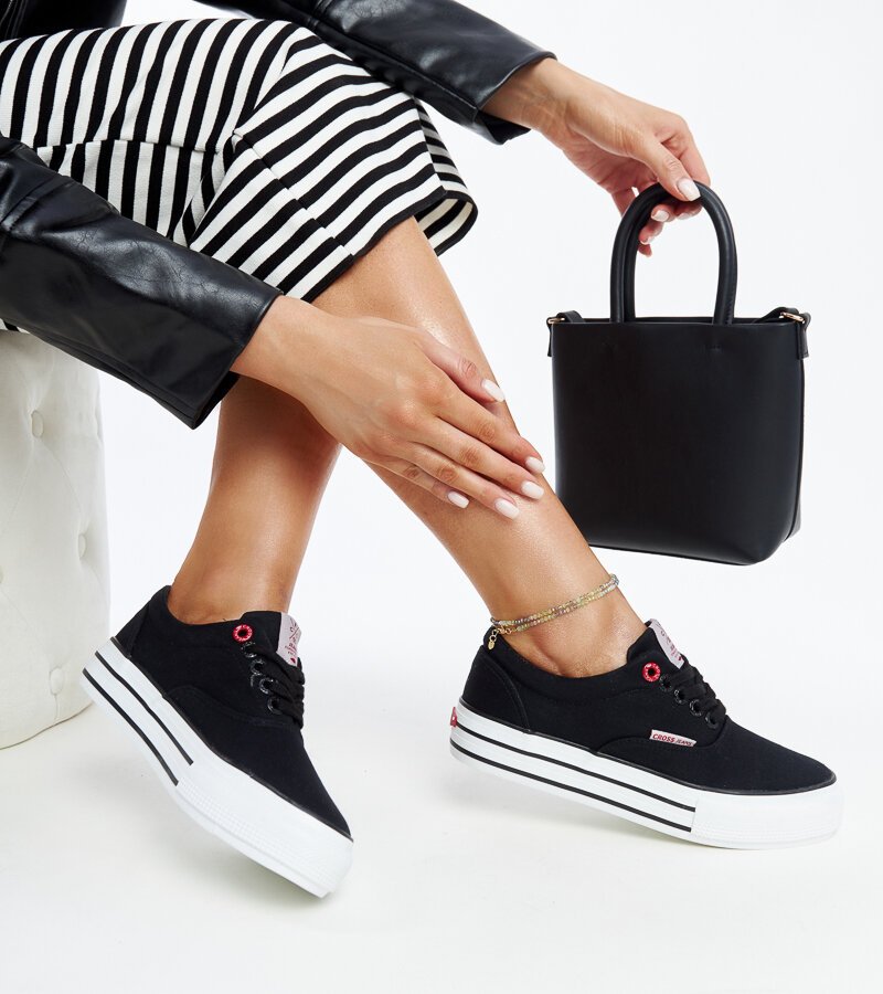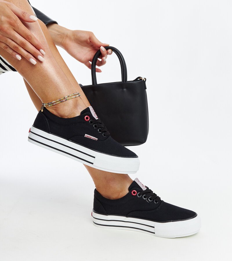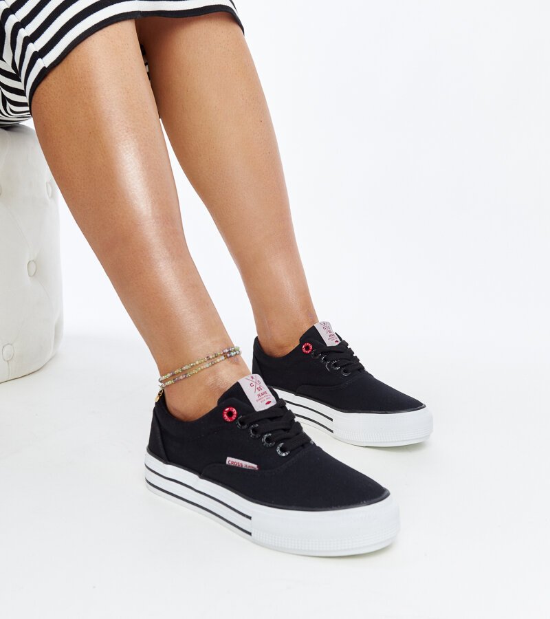 Juodi CROSS JEANS moteriški sportiniai bateliai grubiu padu - puikus pasirinkimas madingoms moterims, vertinančioms patogumą ir stilių. Pagaminti iš aukštos kokybės gumos, jie užtikrina puikų sukibimą ir dėvėjimo komfortą. Dėl žemo kirpimo kartu su apvalia nosimi jie ne tik elegantiški, bet ir labai progresyvūs. Nėriniuotas užsegimas suteikia papildomos elegancijos, o jų stilingas dizainas puikiai papildys bet kokį laisvalaikio įvaizdį.