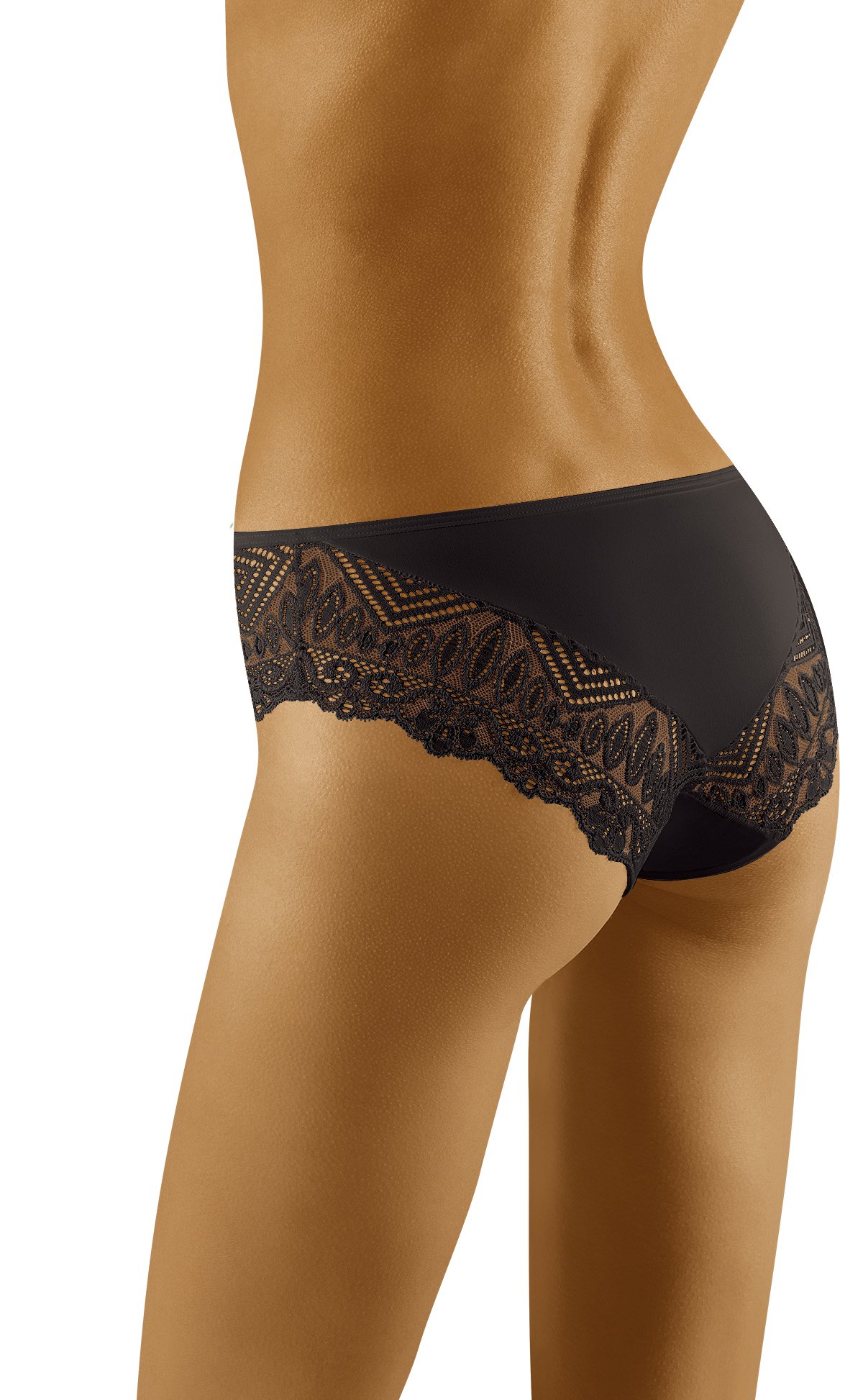Aukštos kokybės Wol-bar moteriškos kelnaitės, pasiūtos iš elegantiškų nėrinių su subtiliu geometriniu raštu ir lygaus audinio. Šonai šiek tiek stipriau apnuoginti, ažūriniai, su iškirpte. Akį traukia lygus audinys, kuris priekyje suformuoja tik liekną, seksualų trikampį. Sėdmenų linija taip pat su nėrinių akcentu. Sudėtis Sudėtis 83 % poliamidas, 17 % elastanas.