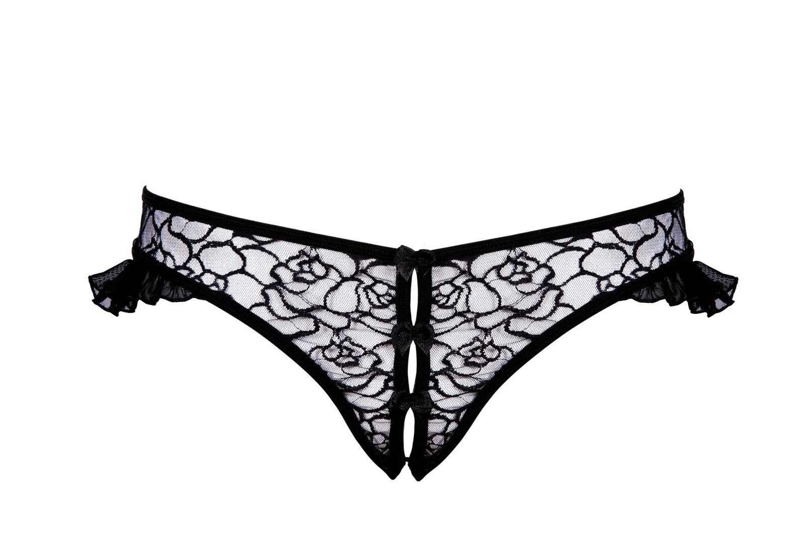 Smulkios juodos kelnaitės, papuoštos mažyčiais lankeliais. Jos šliaužia priekyje ir nuo žvilgsnio neabejotinai koketizuoja. Šonuose koketiški raukinukai. Visos nėriniuotos, minkštos, gražiai gula ant klubų.