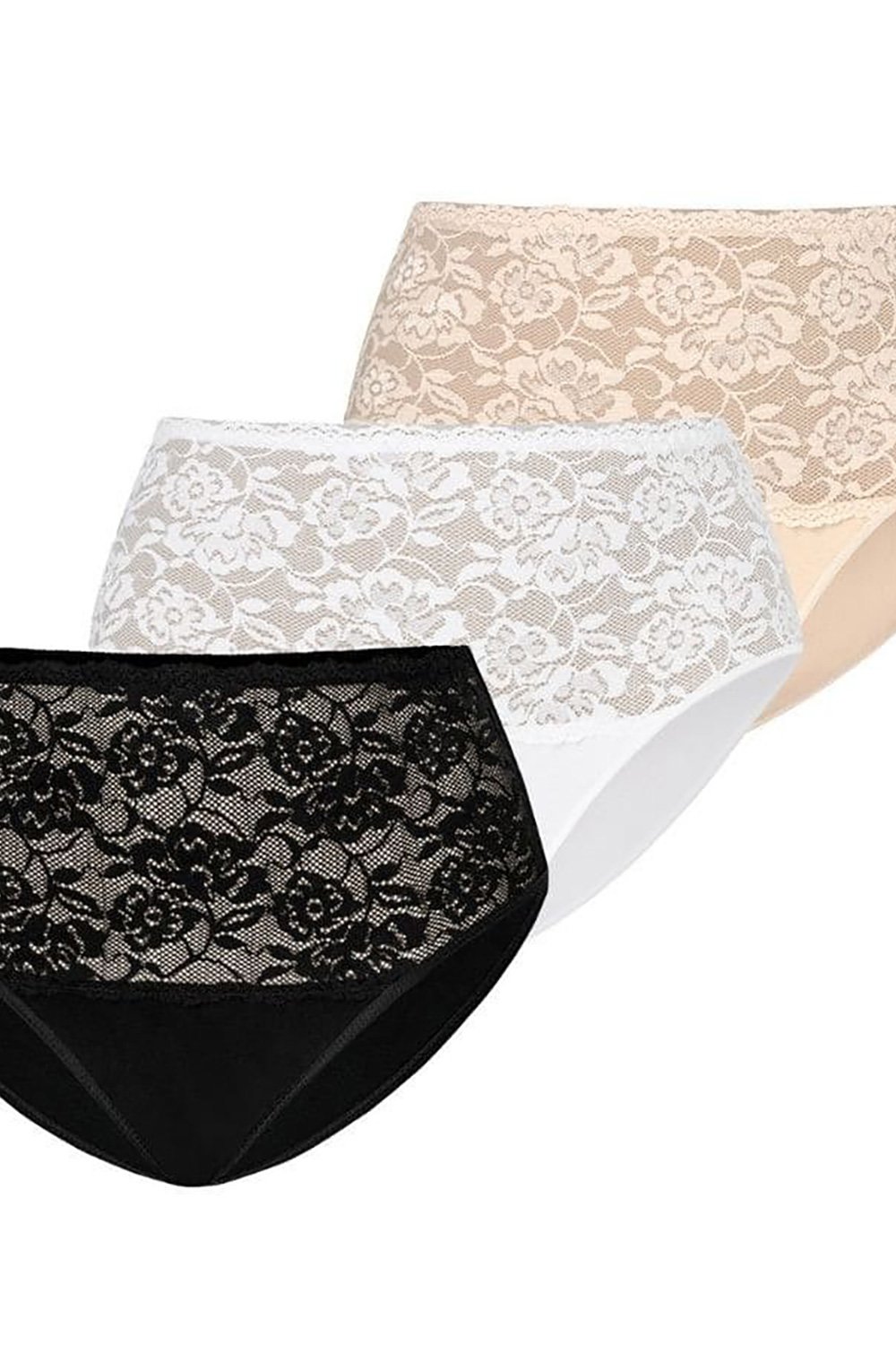 Trijų spalvų moteriškų kelnaičių rinkinys Violetta“ – juodos, baltos ir smėlinės – aukštu liemeniu, iš švelnios medvilnės su nėriniais priekyje, užtikrina komfortą ir elegantišką išvaizdą visai dienai.