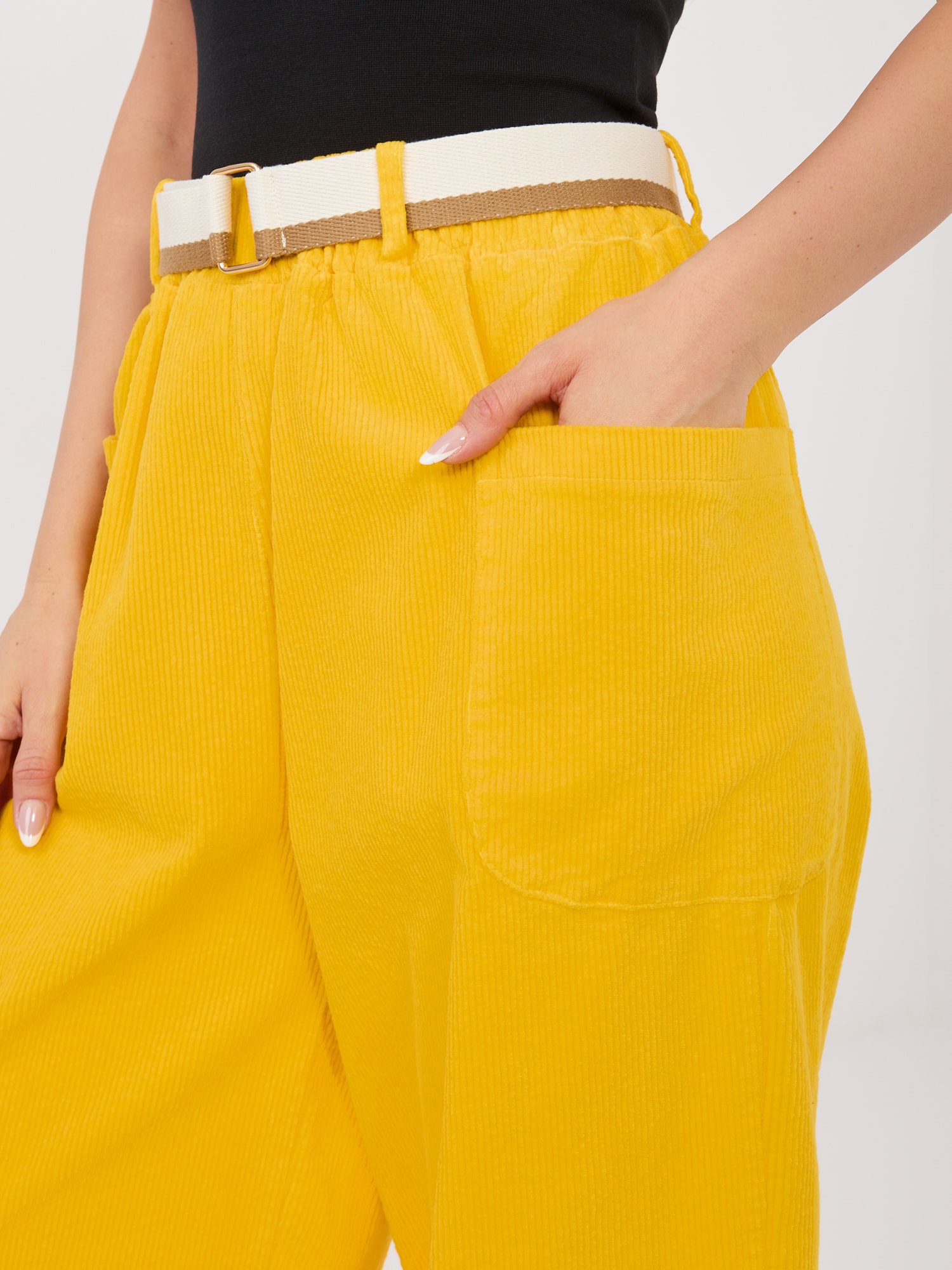 Moteriškos kelnės geltonos – universalus dydis, patogios laisvesnio silueto nešiojimui ir suteikia ryškų akcentą garderobui. Modelis vilki universalų dydį; žemiau pateikti modelio išmatavimai padės įvertinti proporcijas.