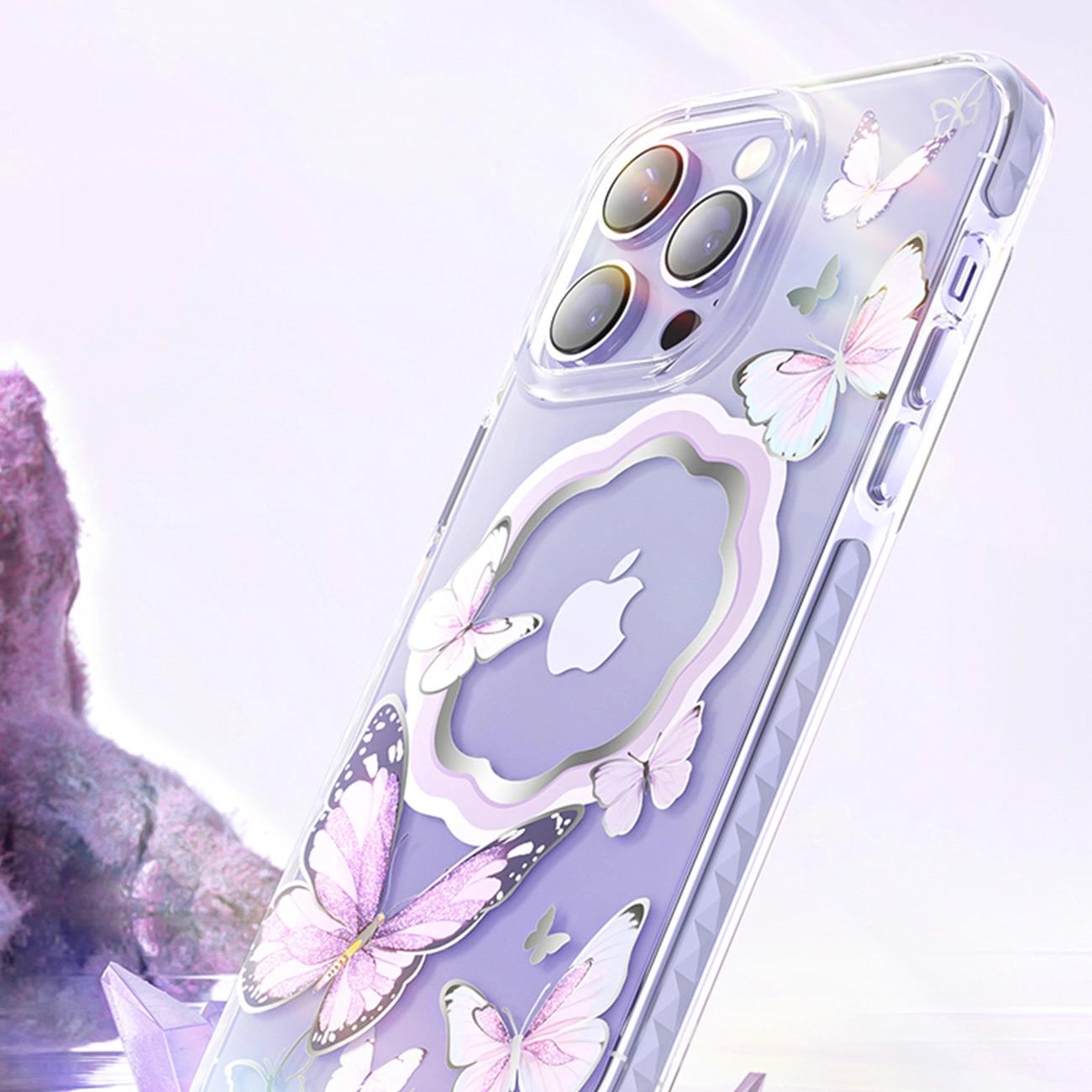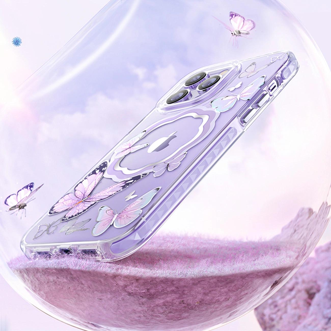 Kingxbar Butterfly Series magnetinis dėklas iPhone 14 Plus MagSafe dėklas su drugeliais rožinės spalvos