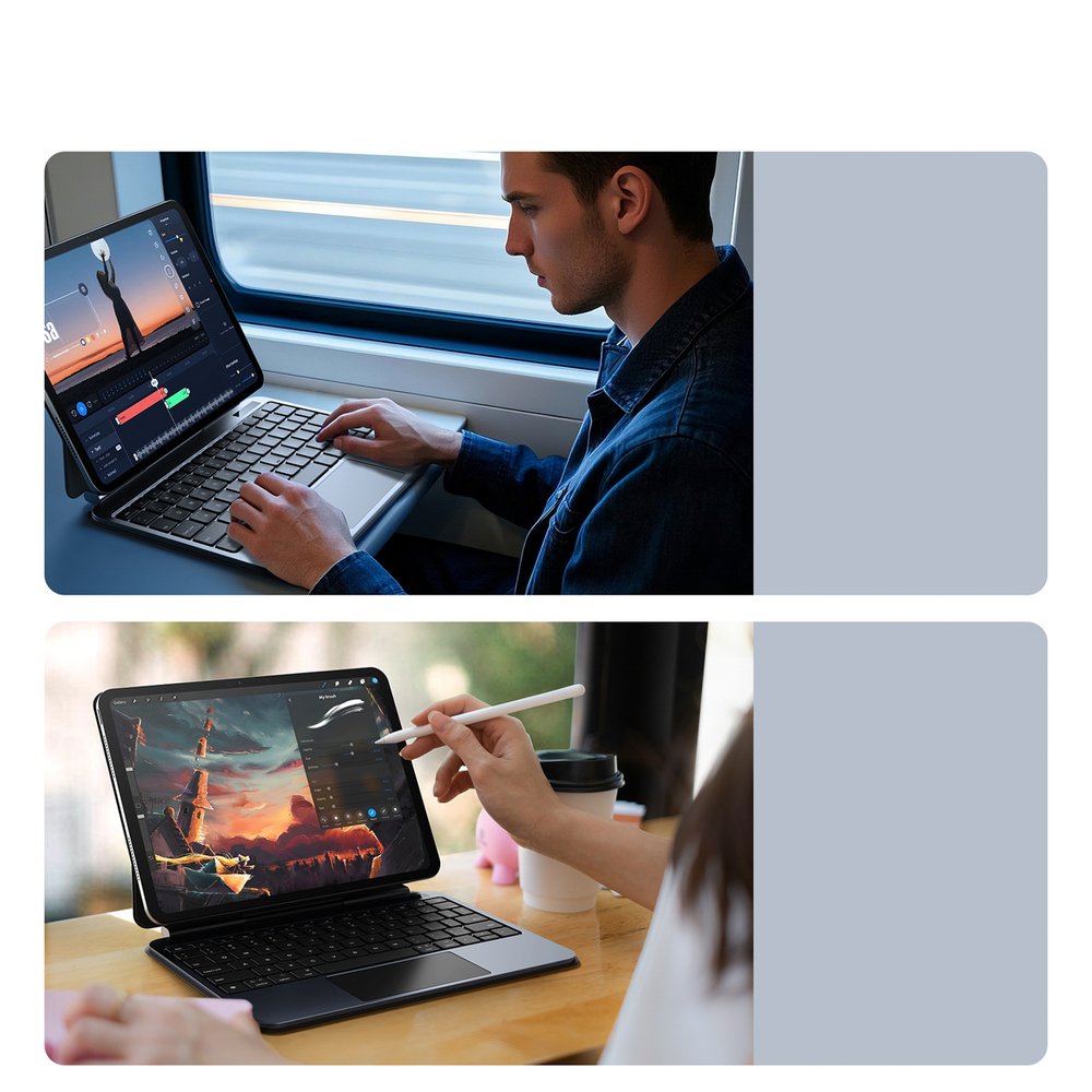 Stilingas ir funkcionalus klaviatūros dėklas iPad Pro 11″ (2024) užtikrina patogų rašymą ir efektyvų darbą bet kur. Touchpad su gestų atpažinimu leidžia valdyti planšetę dar intuityviau.