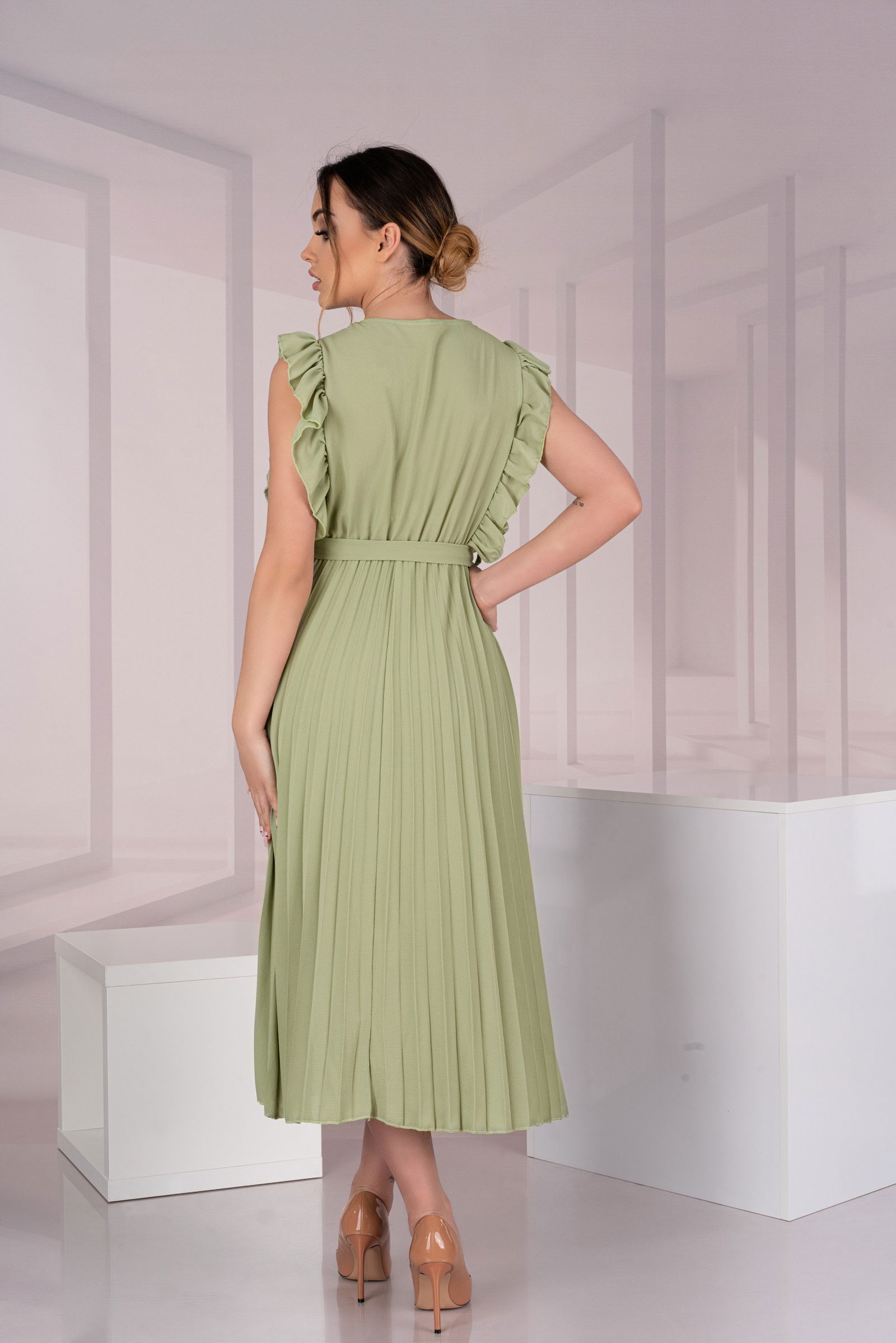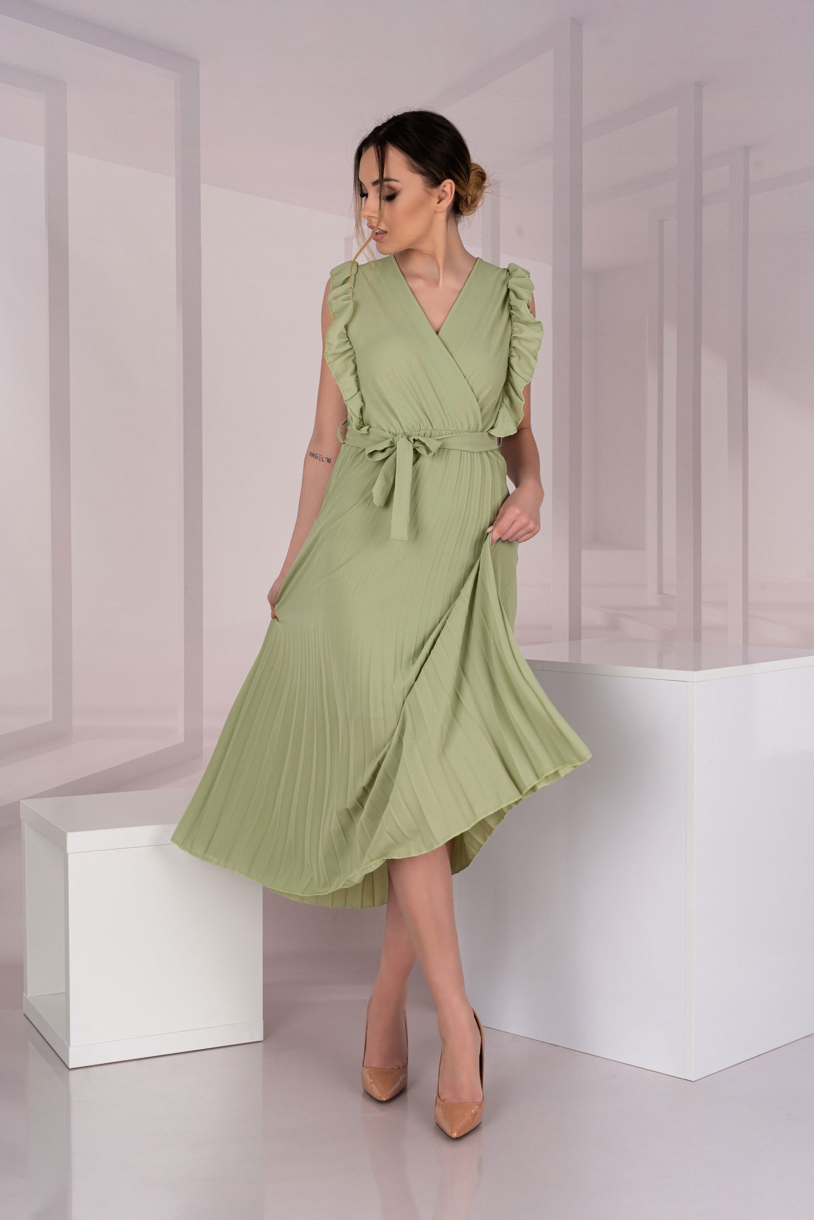 Stilinga, klostuota suknelė, per juosmenį perrišama diržu. Stilinga iškirptė leis jaustis jausmingai ir gražiai. Rankovės puoštos raukinukais.