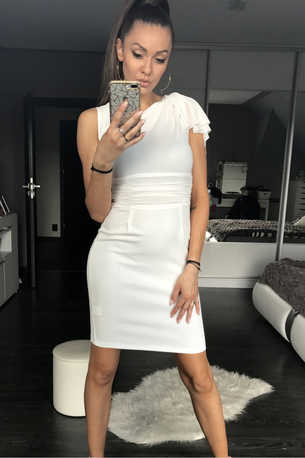 Prigludusio kirpimo suknelė su dekoratyviomis rauktomis rankovėmis. Suknelė ties liemeniu dekoruota klostėmis. Puikiai tinka įvairioms progoms.