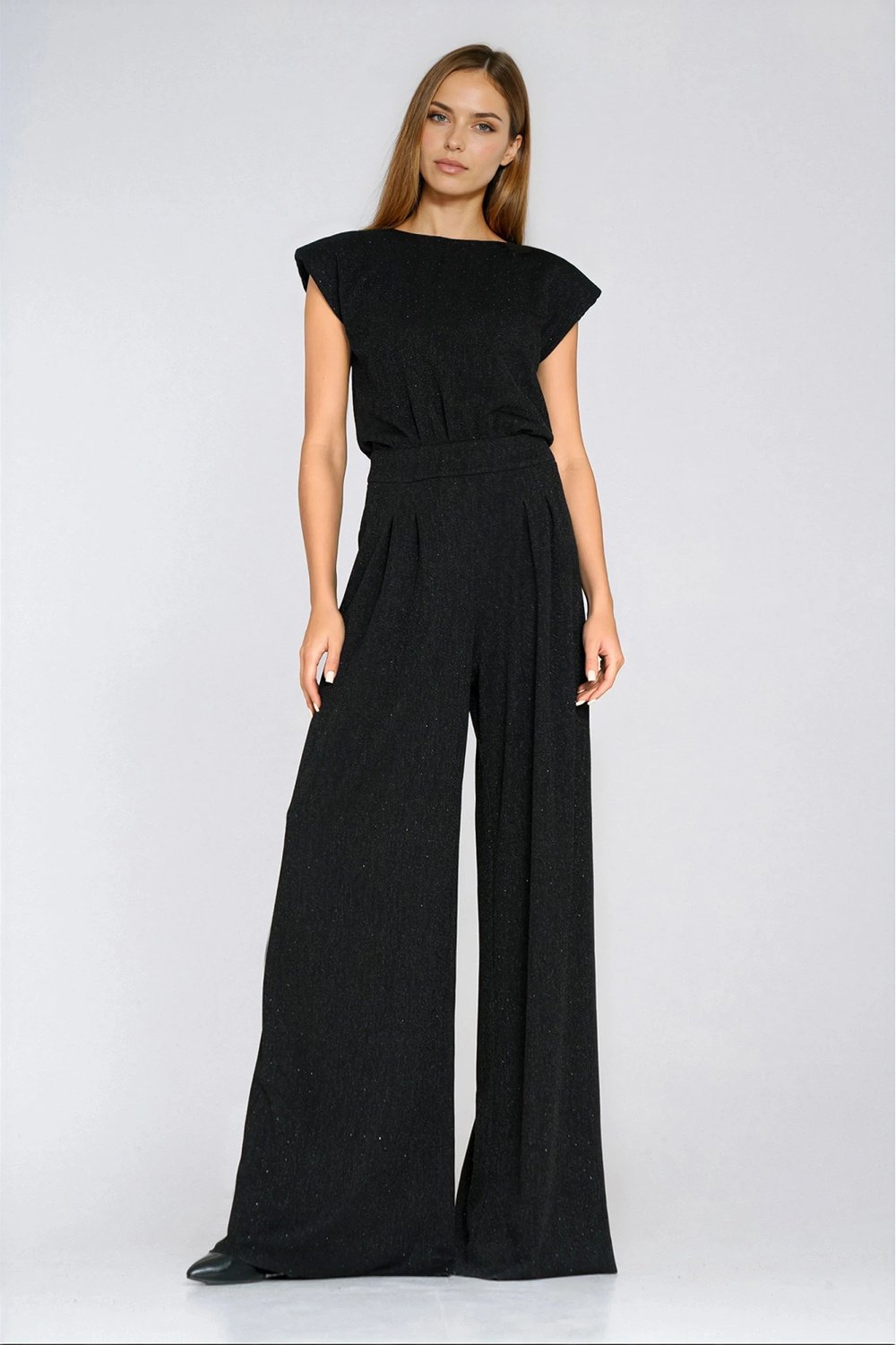 Šis elegantiškas moteriškas kombinezonas yra puikus pasirinkimas vakariniams renginiams, ceremonijoms ir kitoms ypatingoms progoms. Reguliaraus kirpimo modelis su pabrėžta liemens linija ir plačiomis palazzo tipo kelnėmis suteikia elegancijos bei nevaržo judesių. Juodi blizgučiai ir pečių pagalvėlės subtiliai pabrėžia figūrą ir suteikia išskirtinį charakterį.