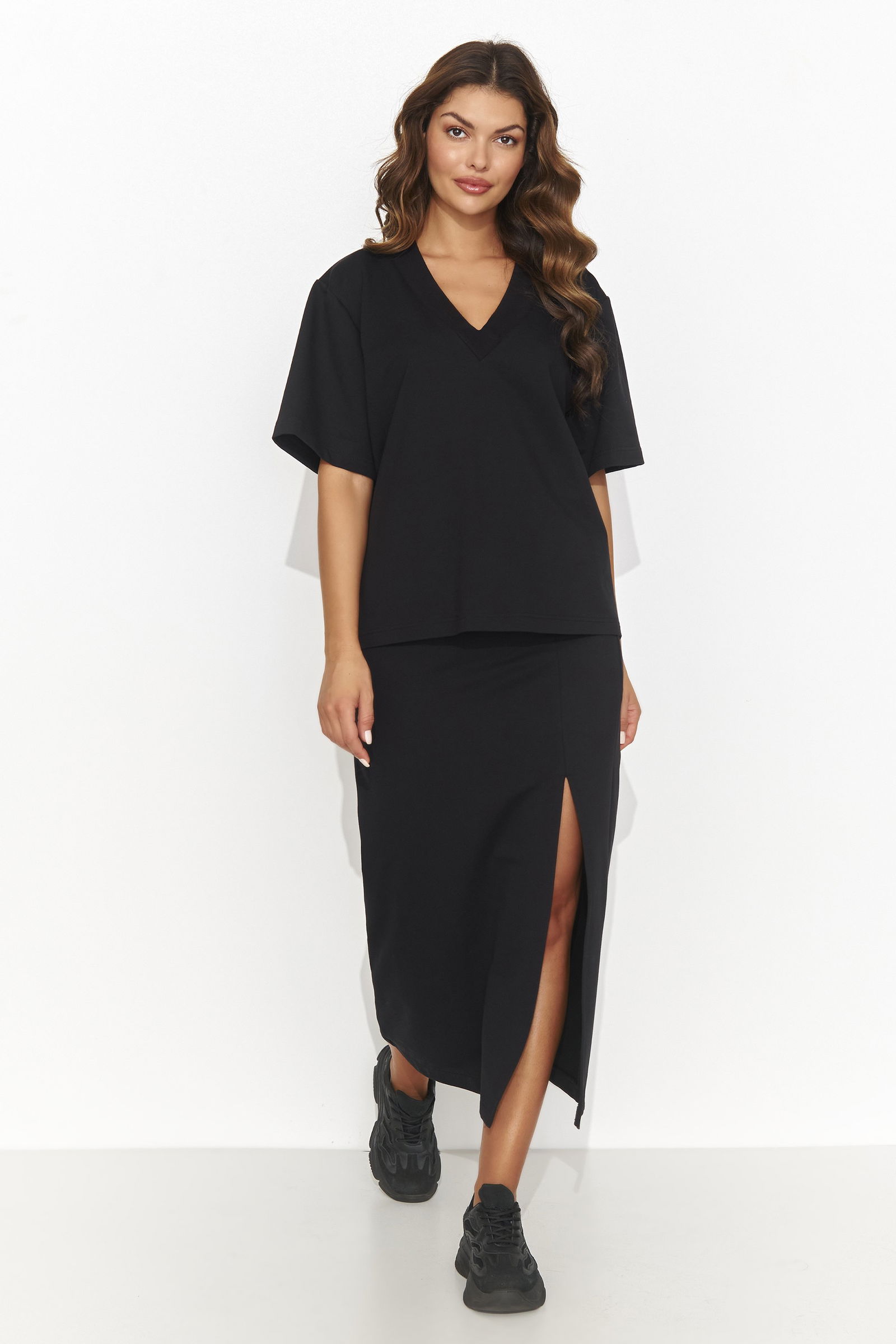Elegancija ir kasdieniškumu dvelkiantis moteriškas rinkinys, kurį sudaro pieštuko formos sijonas iki kelių su subtilia iškirpte ir laisvai krentantys marškiniai trumpomis rankovėmis su širdelės formos iškirpte. Akį traukianti detalė - palaidinės nugaroje esanti dekoratyvinė aukso plokštelė, suteikianti subtilios ekstravagancijos. Šį komplektą galima rinktis iš trijų žavių spalvų šviesiai smėlio, juodos ir šokolado, todėl jį galėsite pritaikyti įvairioms progoms ir stiliui. Pieštuko formos sijonas pabrėžia moterišką siluetą ir kartu suteikia patogumo, o laisvi marškiniai suteikia lengvumo ir laisvės. Tai tobulas klasikos ir modernumo derinys, kuris neabejotinai patrauks mados gerbėjų dėmesį.