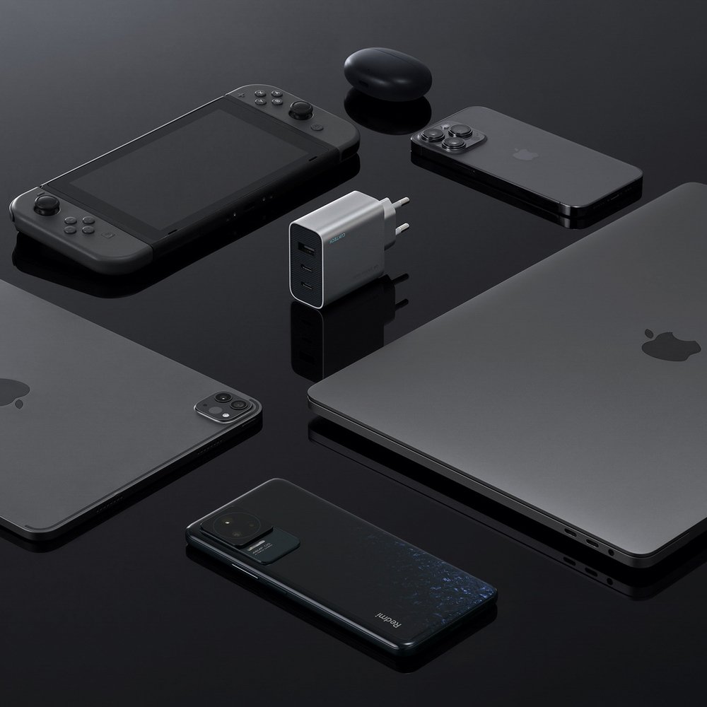 - Kompaktiškas GaN dizainas: mažesni išmatavimai ir mažesnė šilumos sklaida nei tradiciniuose įkrovikliuose