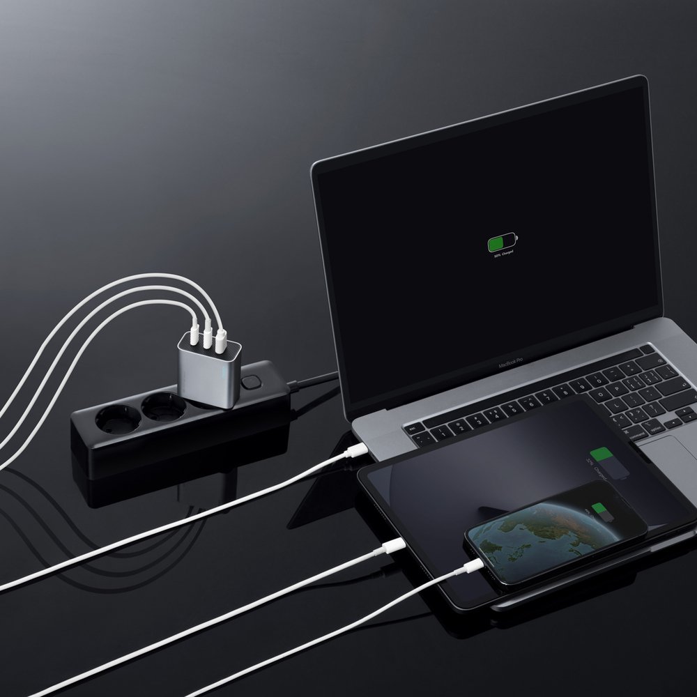 - Universalumas: 2x USB-C ir 1x USB-A jungtys leidžia krauti telefonus, planšetes, nešiojamus kompiuterius ir kitus įrenginius