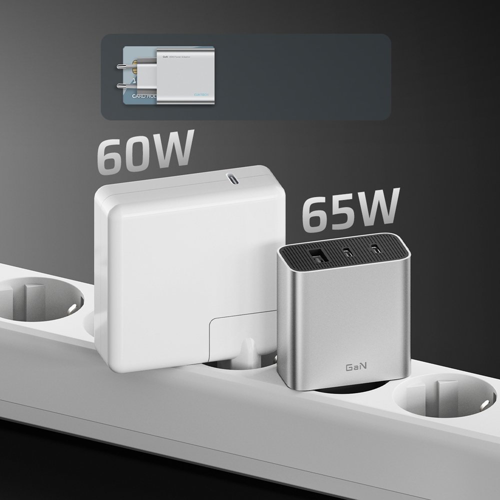 - Galia iki 65 W: užtikrina greitą ir stabilų kelių įrenginių įkrovimą vienu metu