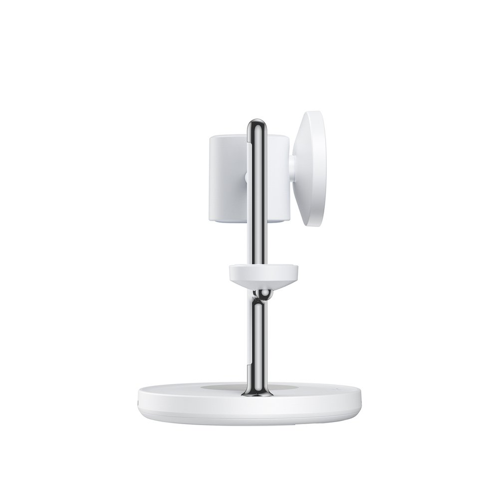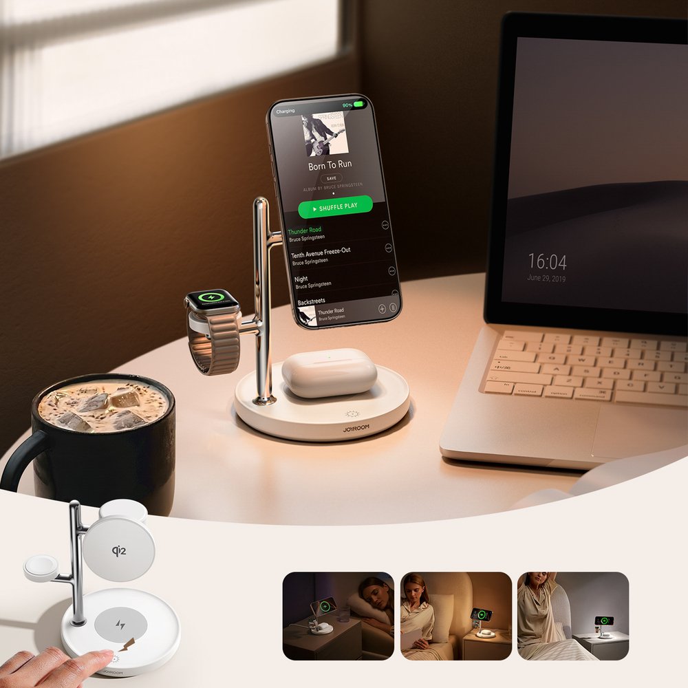 Kroviklis Qi2 – stalinis 4‑in‑1 įkroviklis su integruota indukcine naktine lempute, leidžiantis vienu metu įkrauti telefoną, laikrodį ir ausines. Reguliuojama atrama iki 45° suteikia patogų telefono kampą darbui ar vaizdo peržiūrai. Integruota lemputė su trimis režimais padeda pritaikyti apšvietimą prie dienos ritmo.