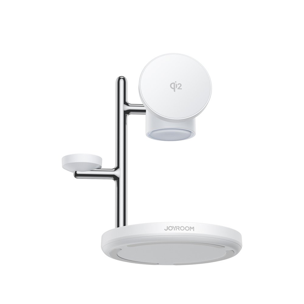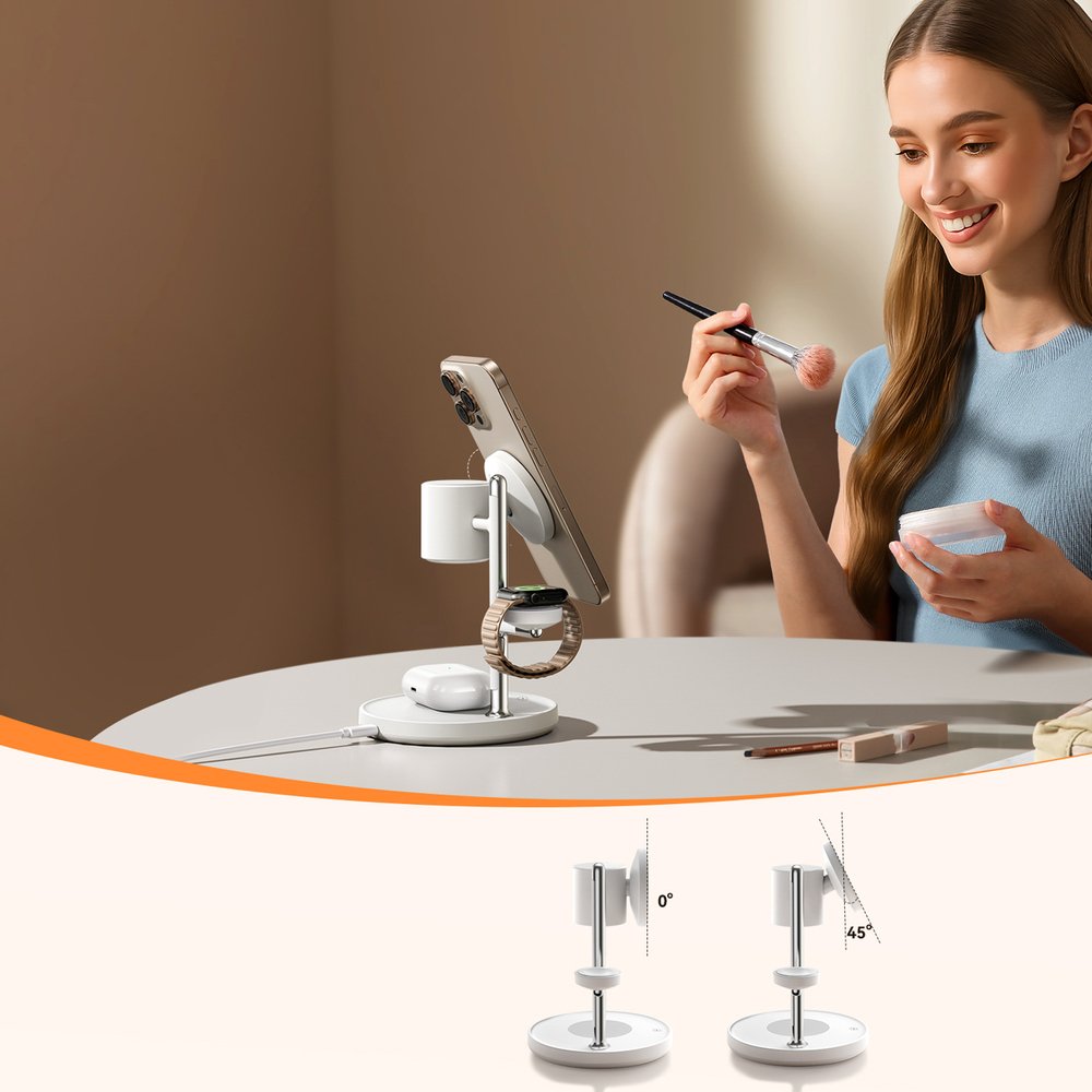 Tinka darbo stalui arba naktinei spintelei — vienoje stotelėje laikykite telefoną, išmanųjį laikrodį ir ausines. Suderinamumas apima iPhone 16–12 serijas, iPhone 11–8 su MagSafe, Apple Watch (Ultra/SE) ir AirPods su MagSafe dėklais, todėl mažėja poreikis keliems įkrovikliams.