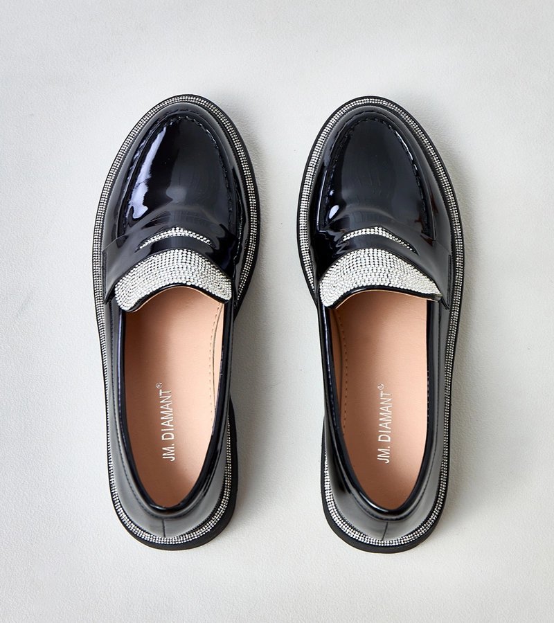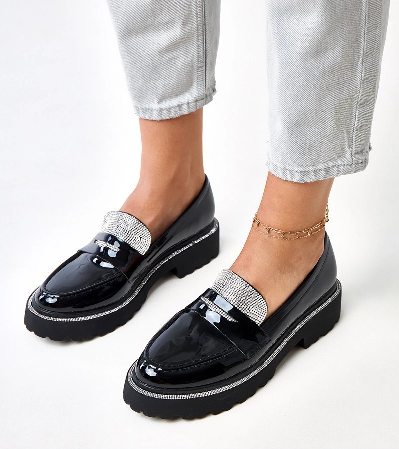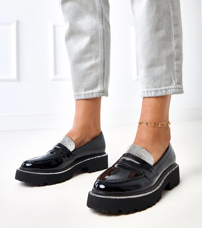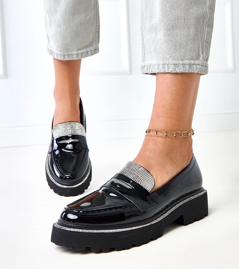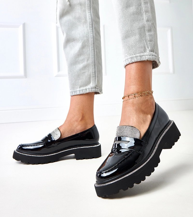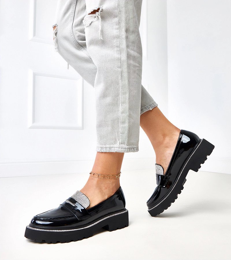 Lakuoti juodi mokasinai Laures su platforma ir žvilgančiomis akutėmis – stilingas pasirinkimas ieškančioms išskirtinumo ir patogumo viename.