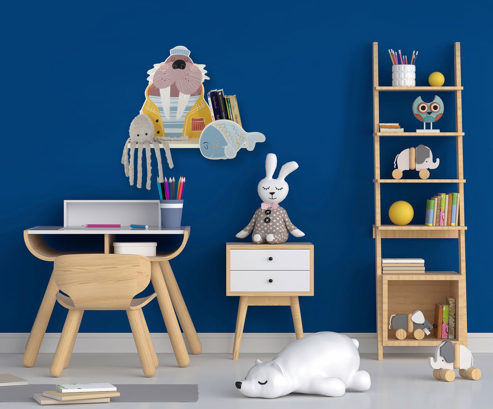 Spalvinga ir saugi MDF lentyna su jūrų vėplio motyvu – ideali vieta vaiko knygoms, žaislams ir dekoracijoms laikyti.