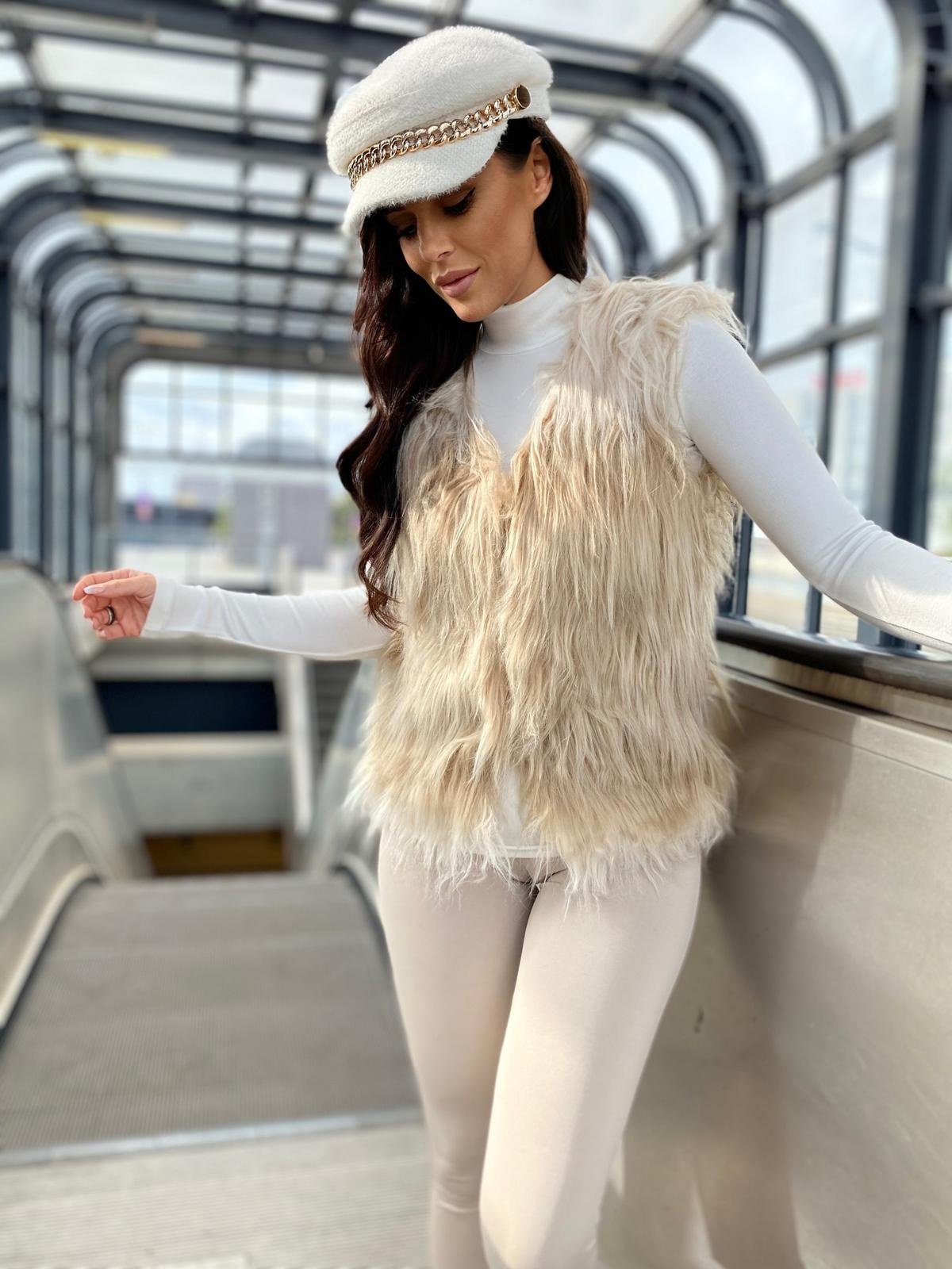 - Iš ko pagaminta? Liemenė pagaminta iš 100 % poliesterio – dirbtinio kailio imitacijos.