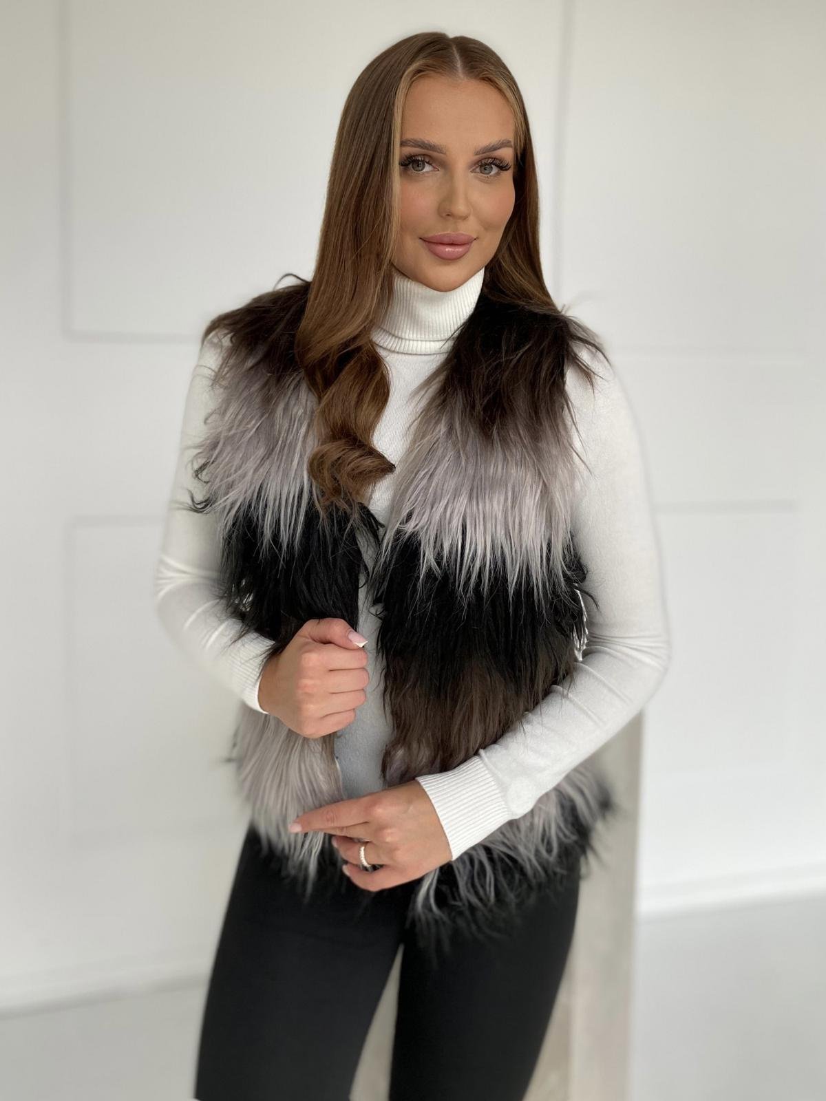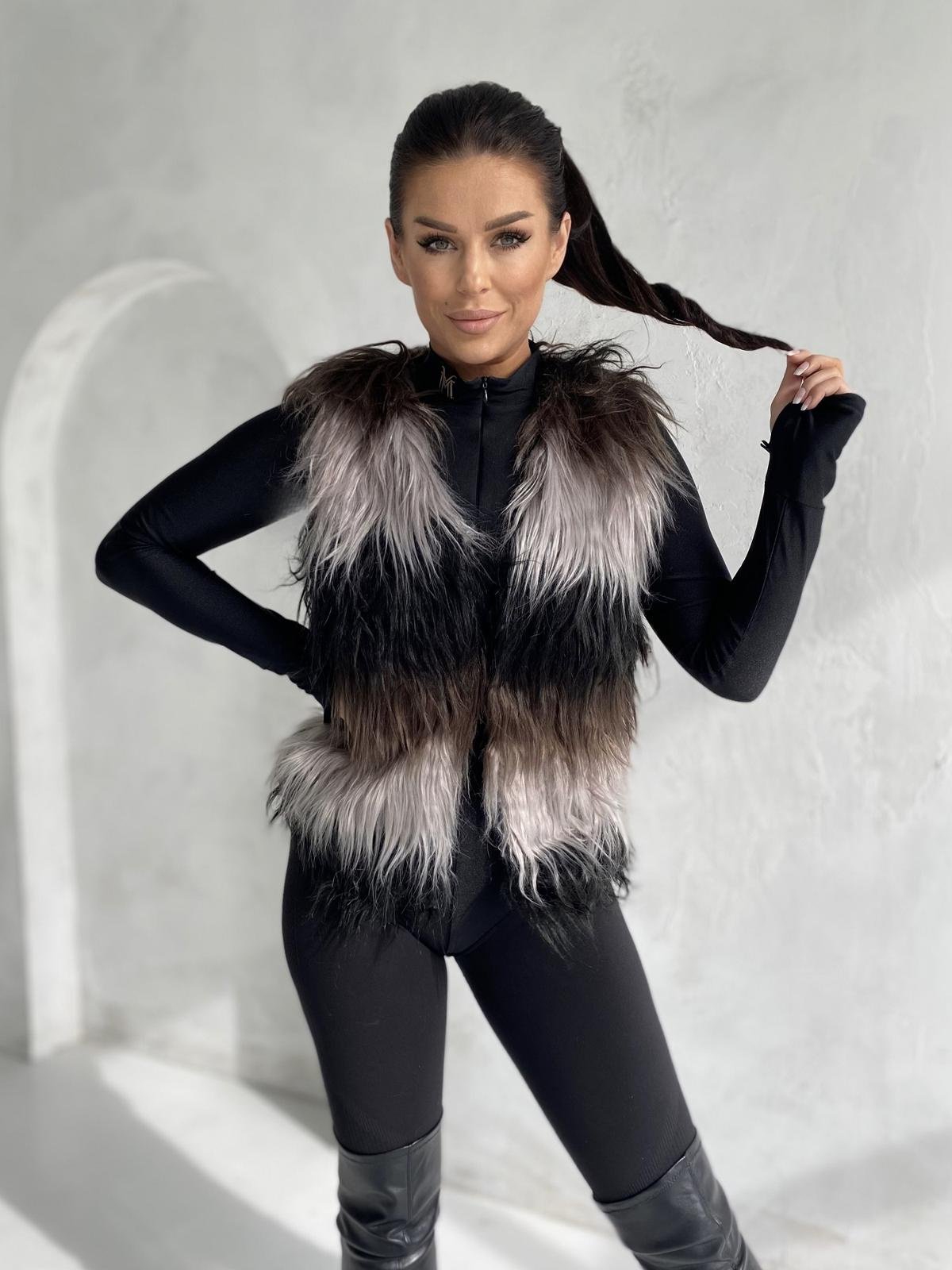 Ši šviesiai pilka moteriška liemenė iš dirbtinio kailio puikiai tinka kasdieniam stiliui – šilta, lengva ir universali.