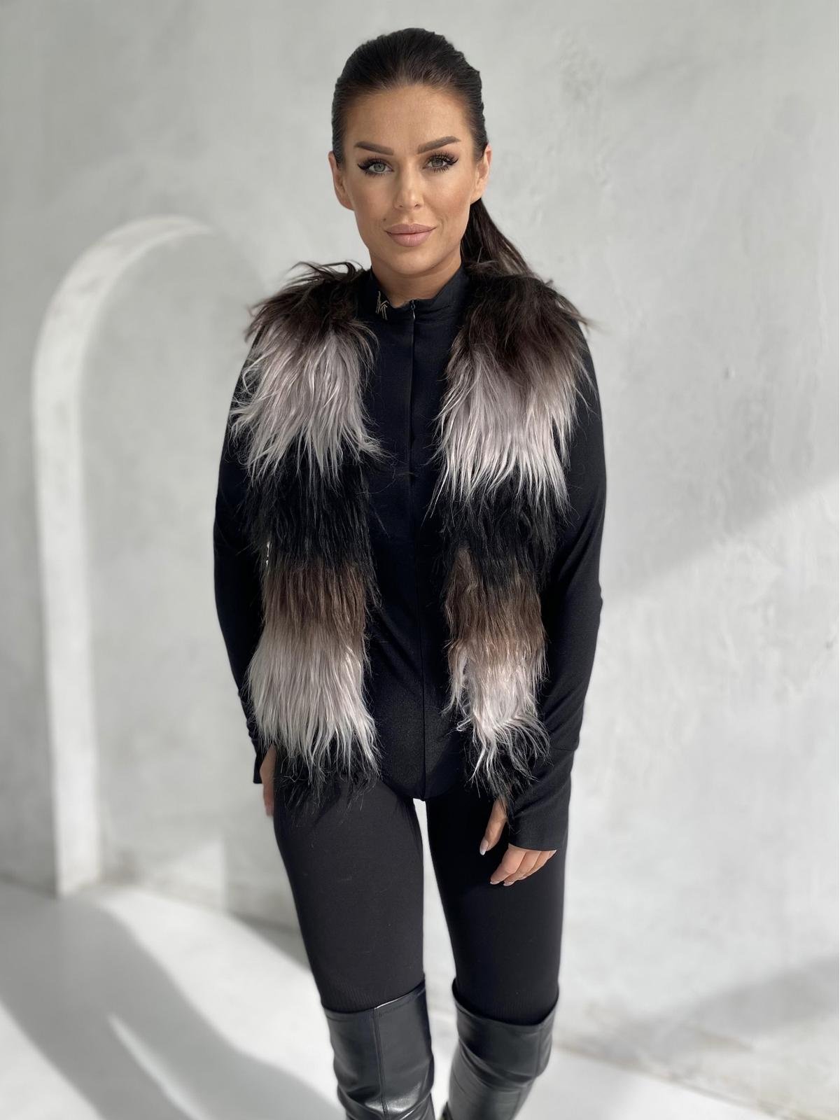 - Iš ko pagaminta? Liemenė pagaminta iš 100 % poliesterio – dirbtinio kailio imitacijos.