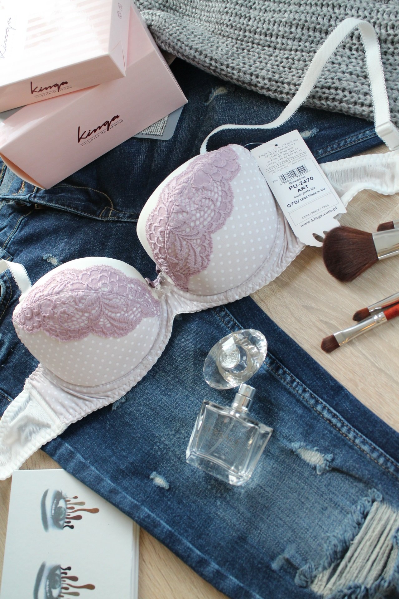 Miela ir romantiška push up liemenėlė, kuri ne tik puikiai atrodo, bet ir puikiai pakelia bei padidina krūtinę! Kaušeliai apvilkti minkštu minkštu įdomaus rašto audiniu. Kaušelių apačia pilka, dekoruota baltais žirneliais, viršutinė dalis lygi, ecru atspalvio. Per vidurį yra gausiai dekoruoti gražios alyvinės spalvos nėriniai. Visuma atrodo itin koketiškai! Viršutinėje dalyje yra nuimami dirželiai ir nuimamos push up pagalvėlės.