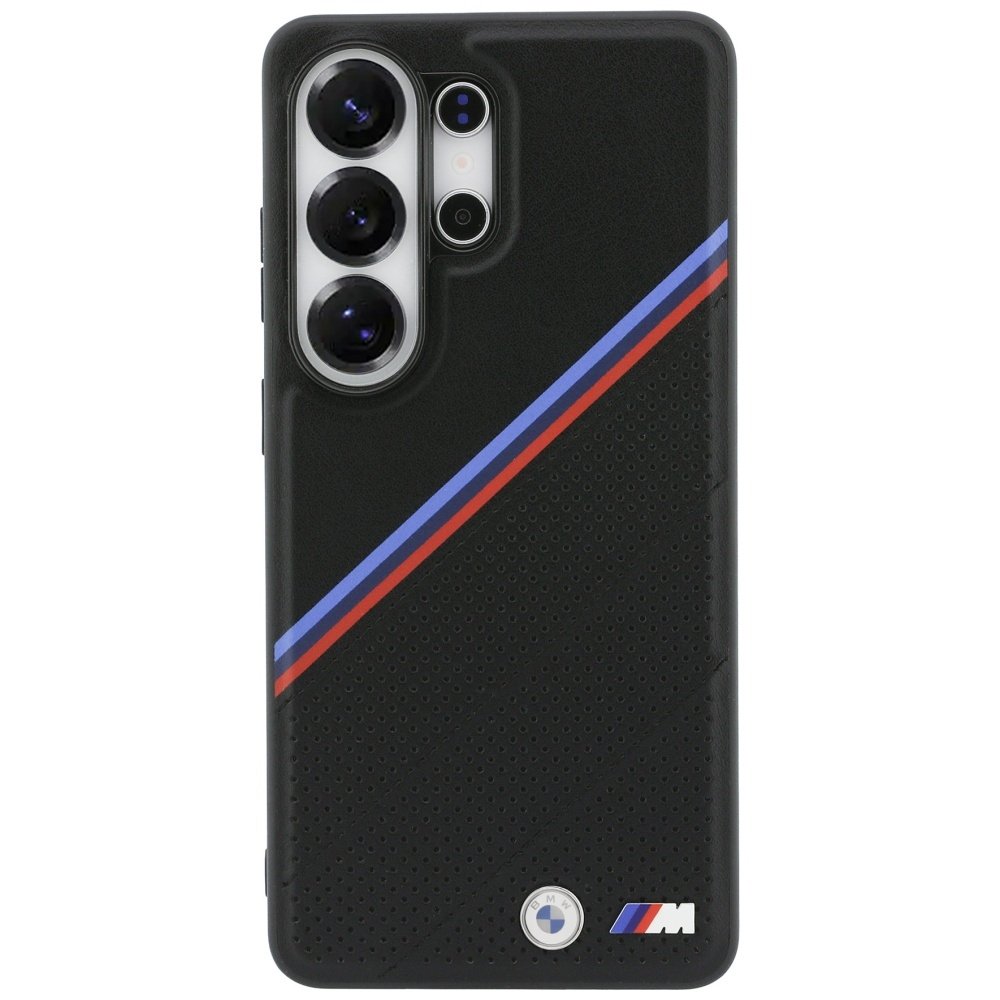 Samsung Galaxy S26 Ultra dėklas, suderinamas su MagSafe, juodos spalvos su BMW M dryžiais ir metaliniu logotipu. Dėklo išorė pagaminta iš dirbtinės odos su perforuotu raštu, o konstrukciją sudaro PC ir TPU sluoksniai, suteikiantys ploną, bet apsauginį profilį. Lanksčios kraštinės palengvina uždėjimą ir nuėmimą, o pakeltas kameros rėmelis ir mygtukų apdaila mažina įbrėžimų riziką.