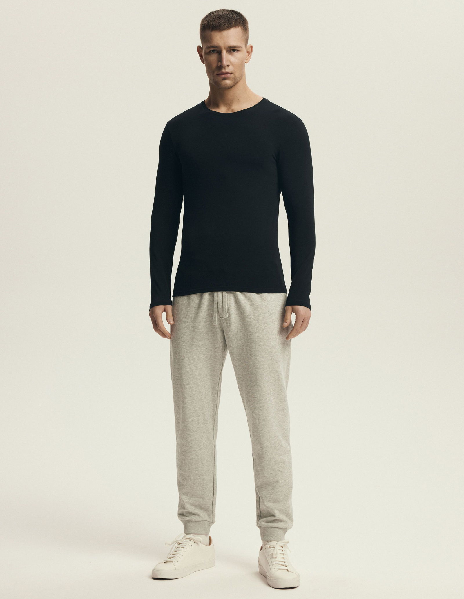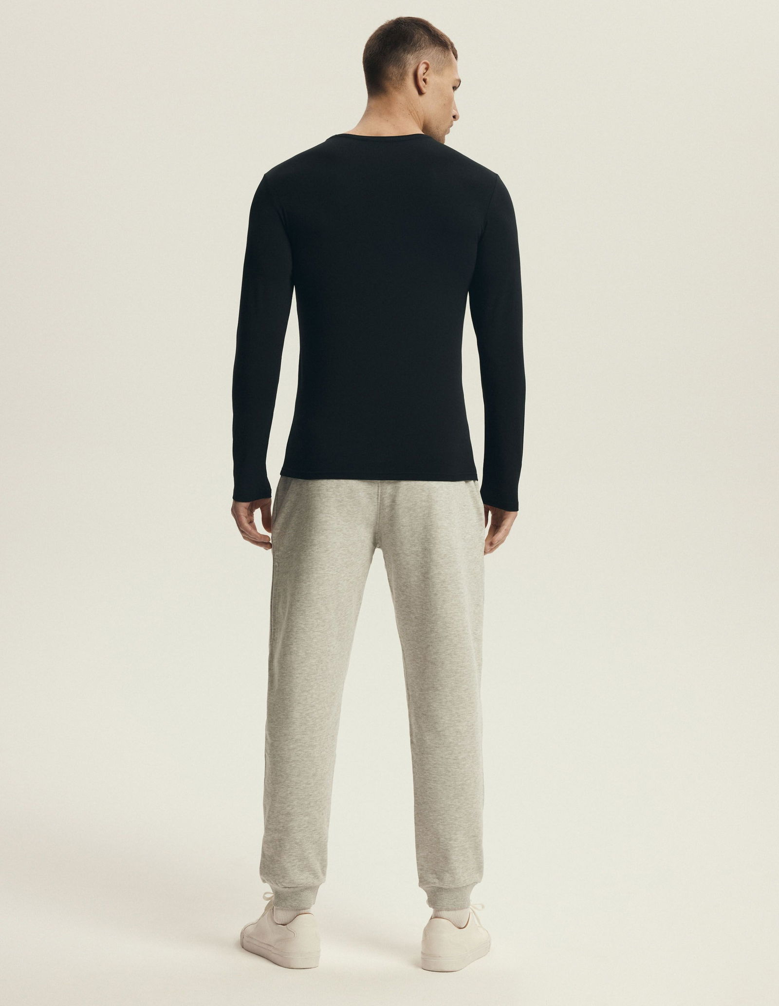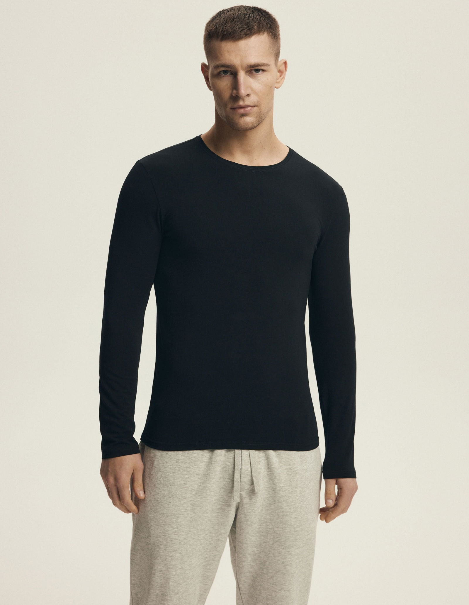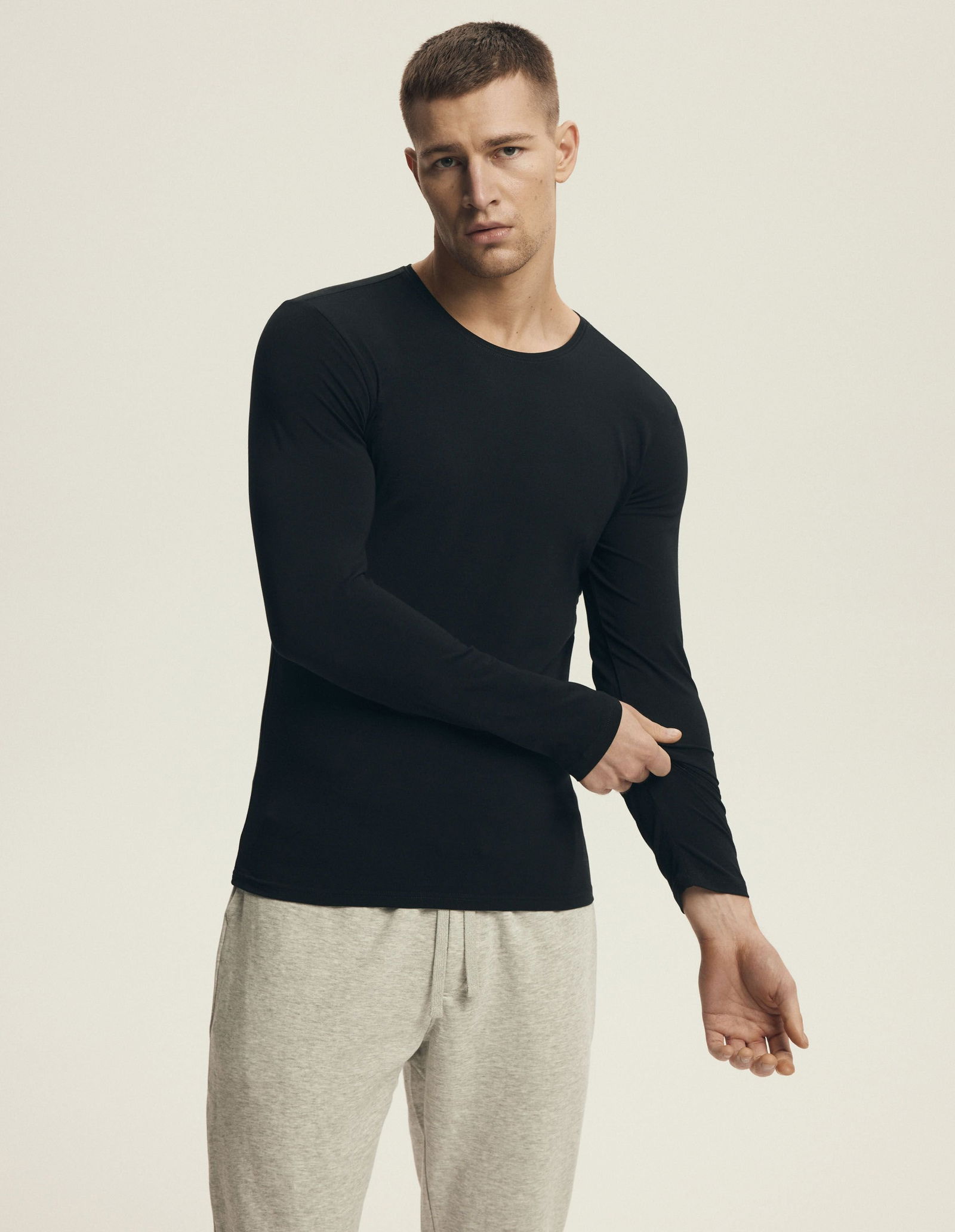 Vyriški juodi marškinėliai ilgomis rankovėmis, pagaminti iš švelnios medvilnės su elastanu, puikiai tinka kasdieniam dėvėjimui – komfortiški, tamprūs ir stilingi.