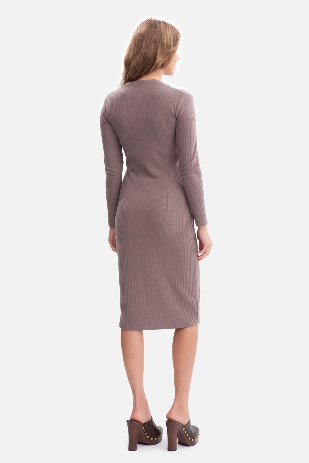 Raižyto audinio megzta suknelė subtiliai išryškina siluetą, suteikdama patogumo ir elegancijos pojūtį. Midi ilgio modelis su V formos iškirpte ir priekyje esančiu skeltuku idealiai tinka ieškančioms klasikos su moderniu akcentu. Minimalistinis dizainas be pamušalo ar kišenių puikiai dera tiek kasdienėje rutinoje, tiek ypatingesnėse progose.