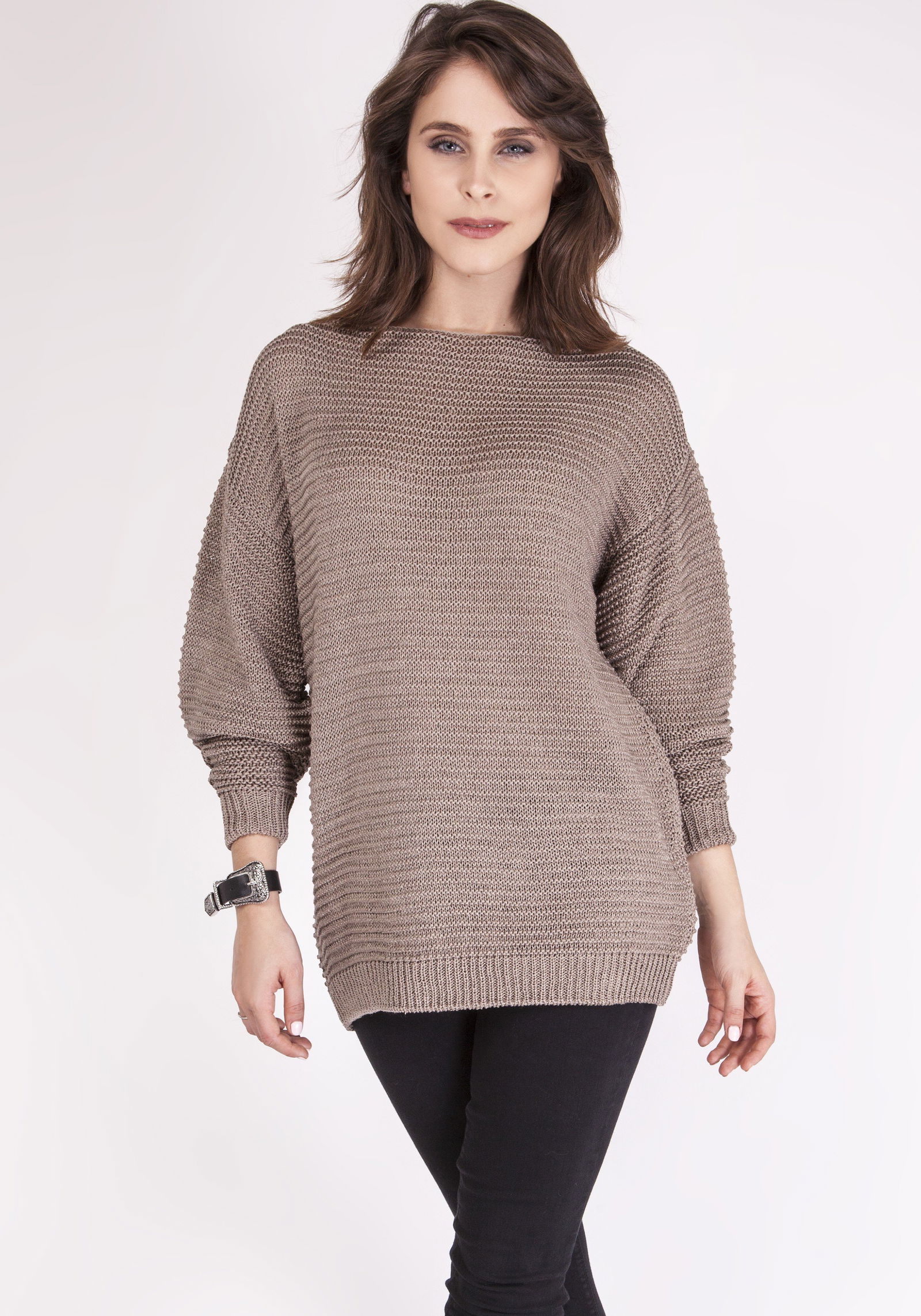 Labai madingas Bat kirpimo megztinis - šiek tiek laisvesnis viršuje, todėl labai patogus. Rankovės baigtos raišteliais. Gražiai atrodo patrauklus, plonų verpalų pynimas. Valties iškirptė. Lenkijos prekės ženklas MKM. Sudėtis 100 % akrilas.