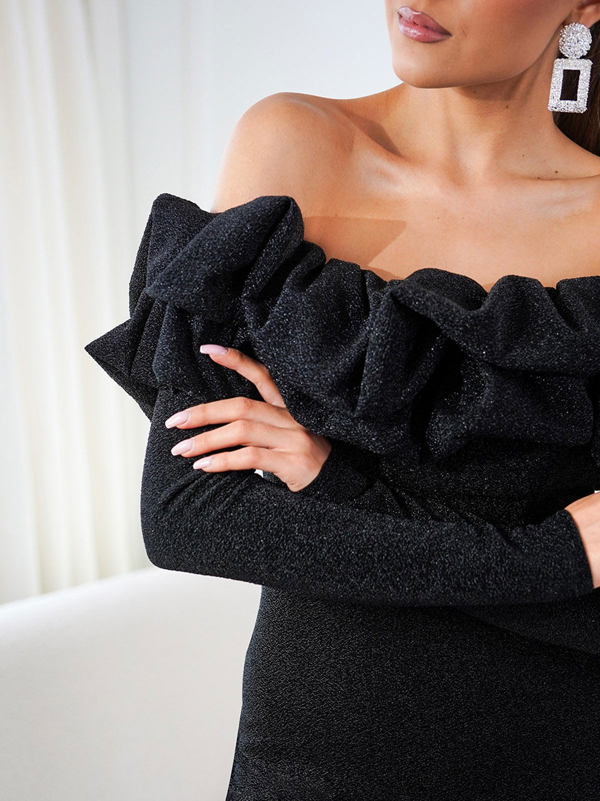 Mini suknelė juoda su raukiniais ir ilgomis rankovėmis vakarui BIANCA