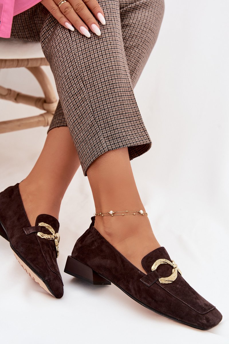 Moteriški mokasinai iš zomšo pasiūlo klasikinį siluetą su kvadratiniu noseliu ir dekoratyvia auksine detale – patogus pasirinkimas tiek į darbą, tiek į šventes. Plokščias padas ir minkšta uždara viršaus konstrukcija užtikrina komfortą visos dienos nešiojimui.