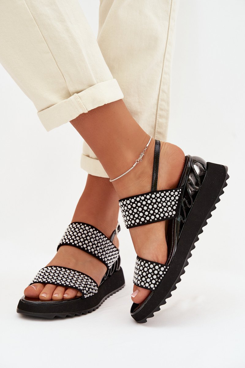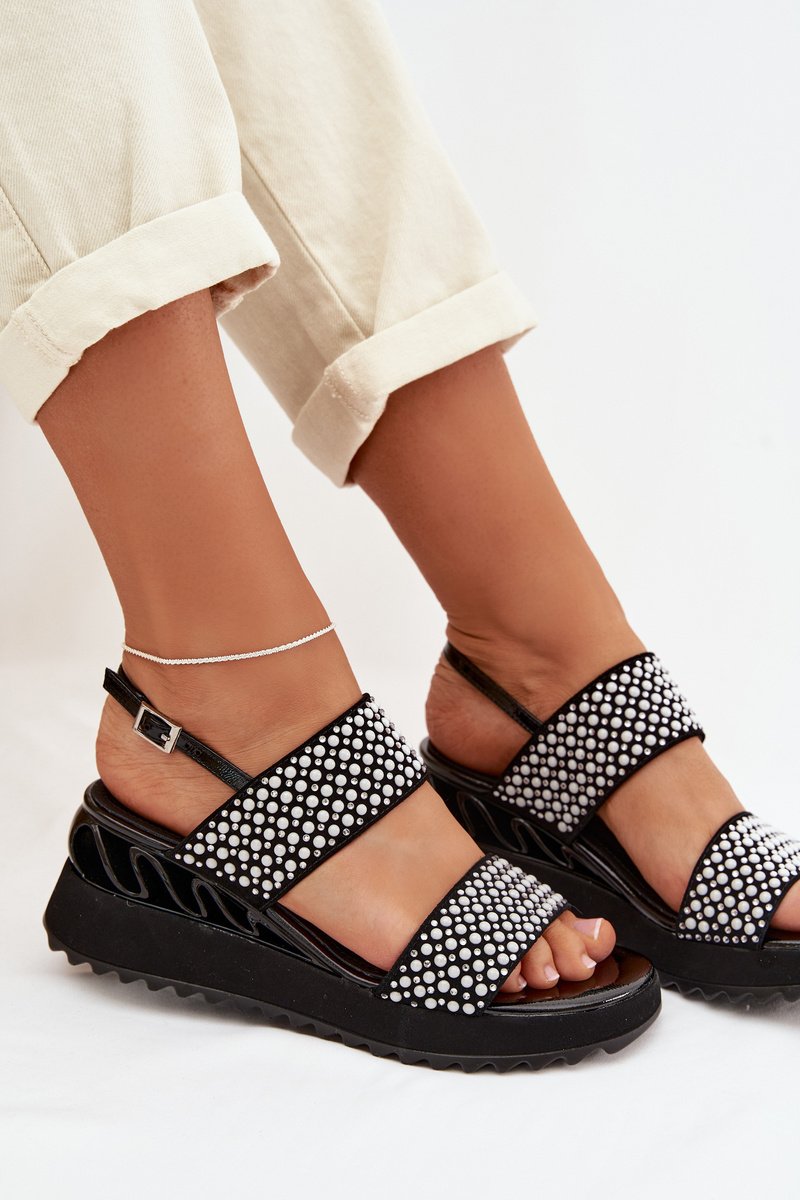 Moteriška basutė juoda – zomšos ir natūralios odos derinys su koturnu ir sagties užsegimu suteikia patogų aukštį ir stabilumą vasaros dienoms. Cyrkonijos ir dekoratyvinės apvalios detalės prideda blizgesio tiek kasdieniam, tiek šventiniam įvaizdžiui. Sagties užsegimas leidžia reguliuoti prisitaikymą prie pėdos.