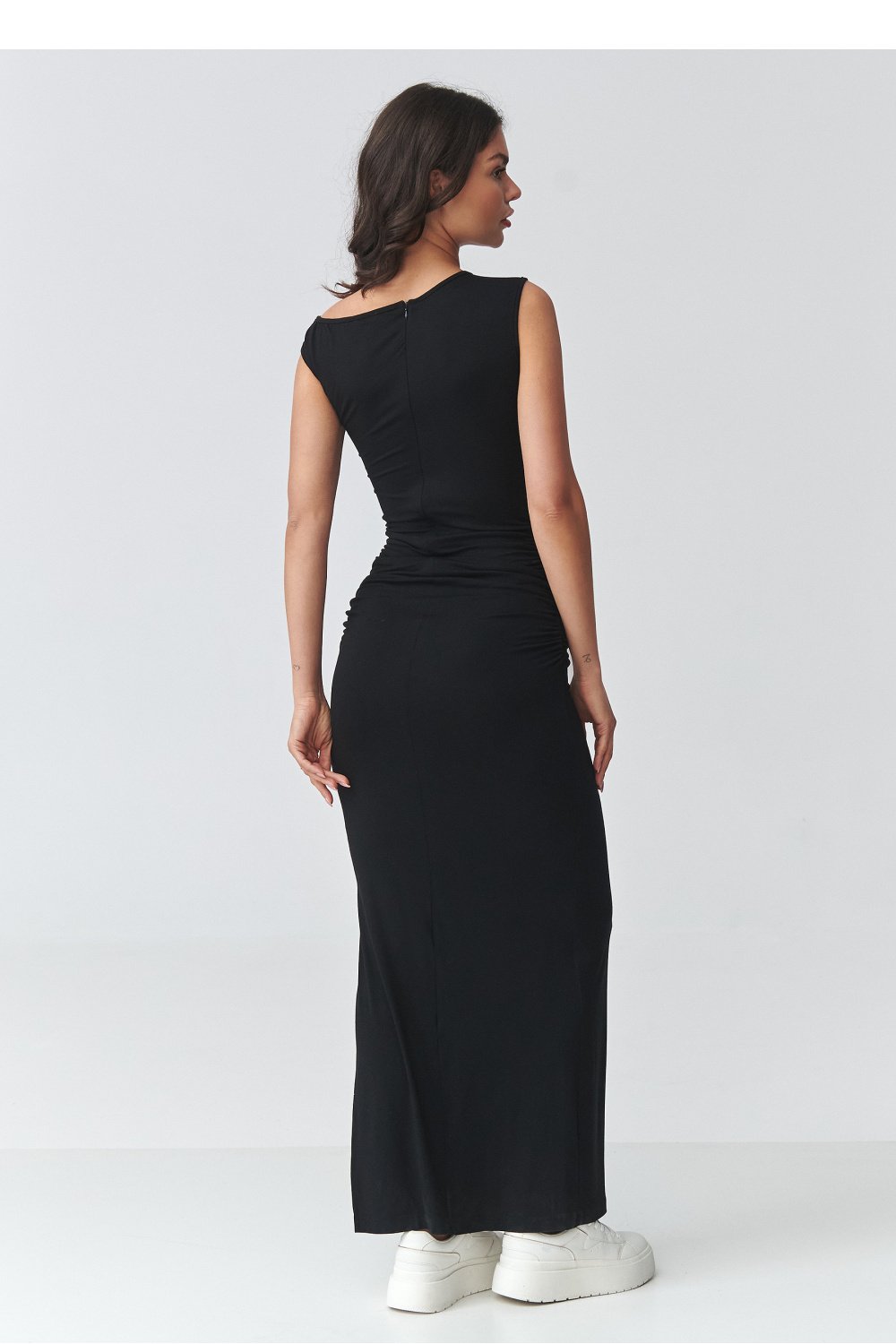 Moteriška ilga suknelė su skeltuke – aptemptas maxi siluetas, kuri vizualiai formuoja figūrą ir suteikia laisvę judesiams. Suknelė be rankovių ir su valtine iškirpte atskleidžia pečius, o liemens ir klubų raukiniai pabrėžia juosmens liniją. Sudėtis: 95% viskozė, 5% elastanas; medžiaga elastinga ir maloni liesti, todėl vakarėlyje ar šventėje jausitės patogiai.