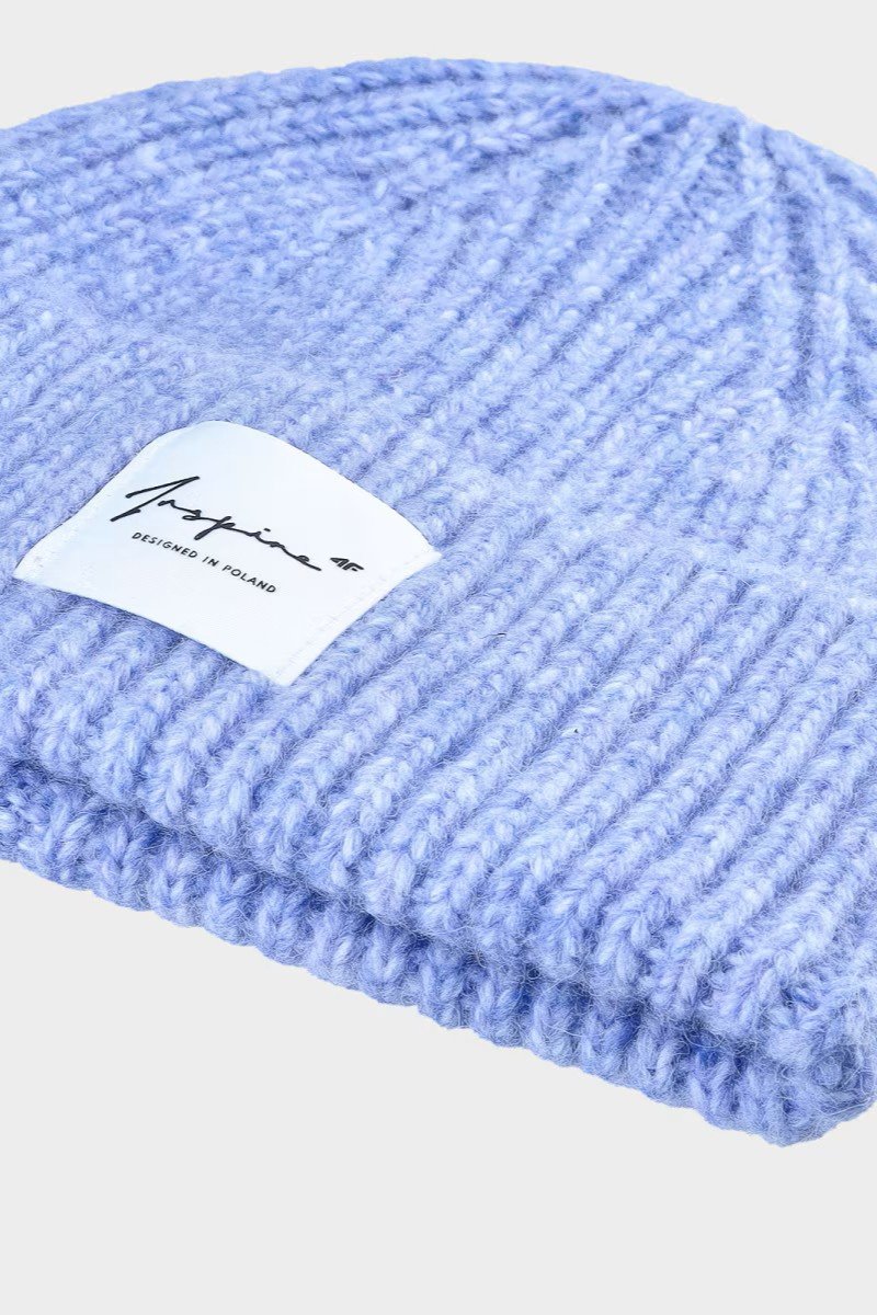 Moteriška kepurė iš sintetinės medžiagos su 10 % vilnos, mėlyna spalva. Klasikinis beanie fasonas su užlenkta manžetėle, skirta šaltesniems orams ir sportiniams deriniams lauke.