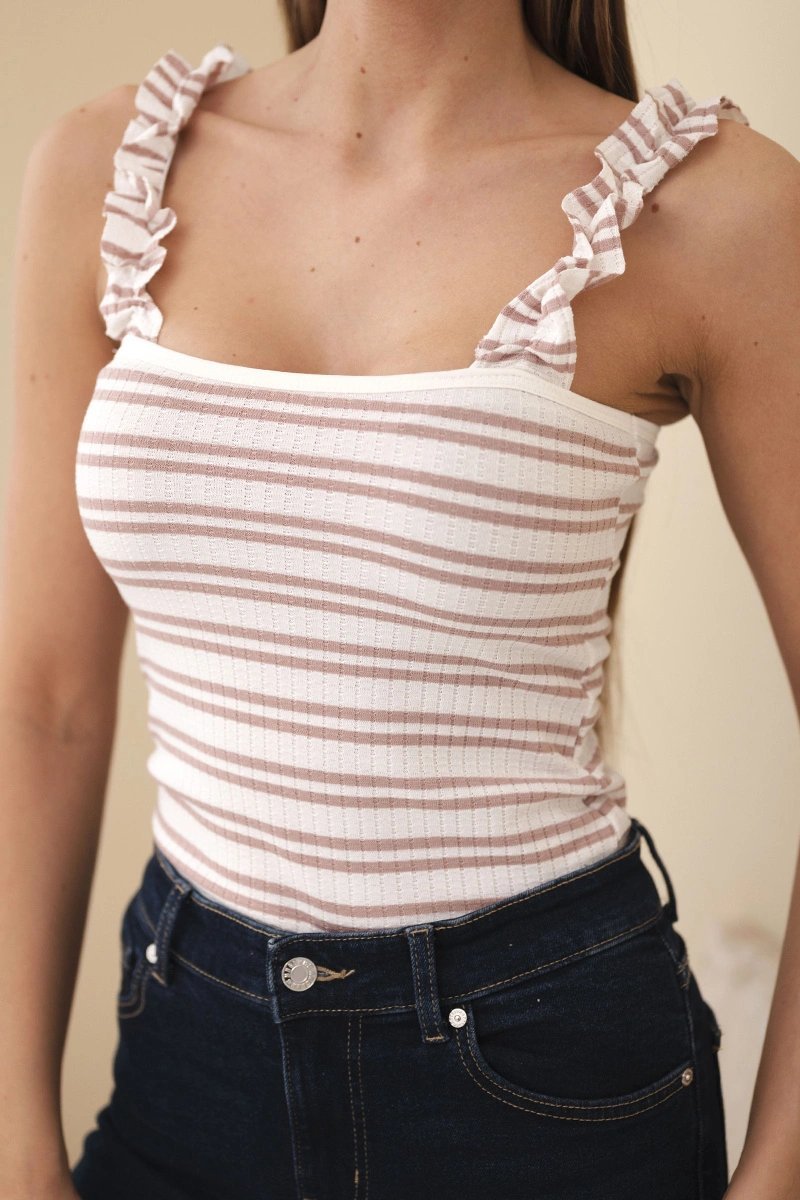 Moteriška maikutė iš medvilnės su elastanu – priglundanti dryžuota viršutinė dalis su raukinukais ant petnešėlių, kuri pabrėžia siluetą ir tinka šiltam sezonui. Priglustanti prążkinta struktūra suteikia formos laikymą bei komfortą visos dienos metu. Universalus dydis aprėpia S–L, todėl maikutę paprasta derinti prie kasdienių vasarinių derinių.