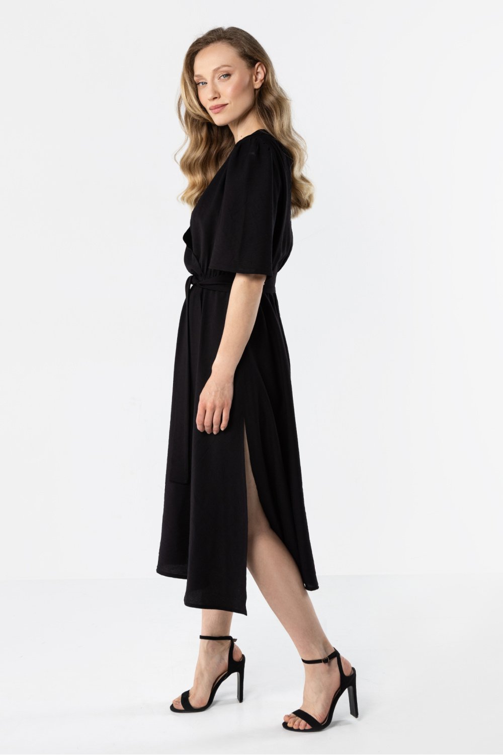 Moteriška midi suknelė su surišimu – lengvos, ant liemens surišamos linijos pabrėžia siluetą, o laisvas sijonas suteikia judesių laisvę ir moteriško lengvumo. V formos iškirptė atveria kaklą ir prailgina siluetą, trumpų, laisvų rankovių kirpimas išryškina pečius. Suknelė tinka tiek kasdienėms, tiek šiek tiek elegantiškesnėms progoms; awama ženklinimas nurodo prekės kilmę.