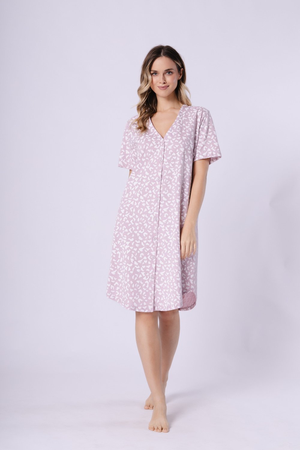 Šie naktinukai – tai patogus pasirinkimas ramiam poilsiui. Laisvas kirpimas, minkšta ir kvėpuojanti 100 % medvilnės medžiaga bei subtilus raštas užtikrina komfortą visą naktį. Modelis siekia iki kelių, turi trumpas rankoves ir pusapvalį apačios kirpimą, kuris suteikia lengvumo ir moteriškumo. Naktinukai visiškai užsegami sagutėmis, o santūri spalvų gama suteikia elegantišką įvaizdį.